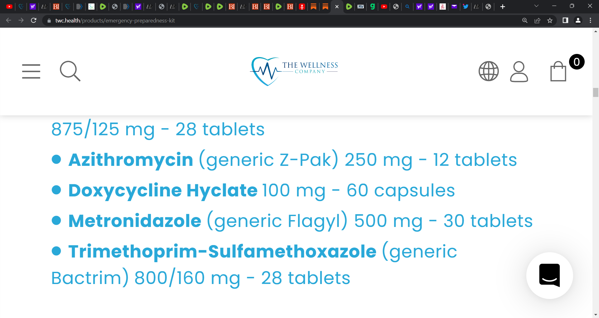 Order here: https://www.twc.health/products/emergency-preparedness-kit?ref=Paul The 8 therapeutics are (https://www.twc.health/products/emergency-preparedness-kit?ref=Paul): Amoxicillin-Clavulanate (generic Augmentin) 875/125 mg - 28 tablets this is a combination prescription antibiotic. Amoxicillin is a