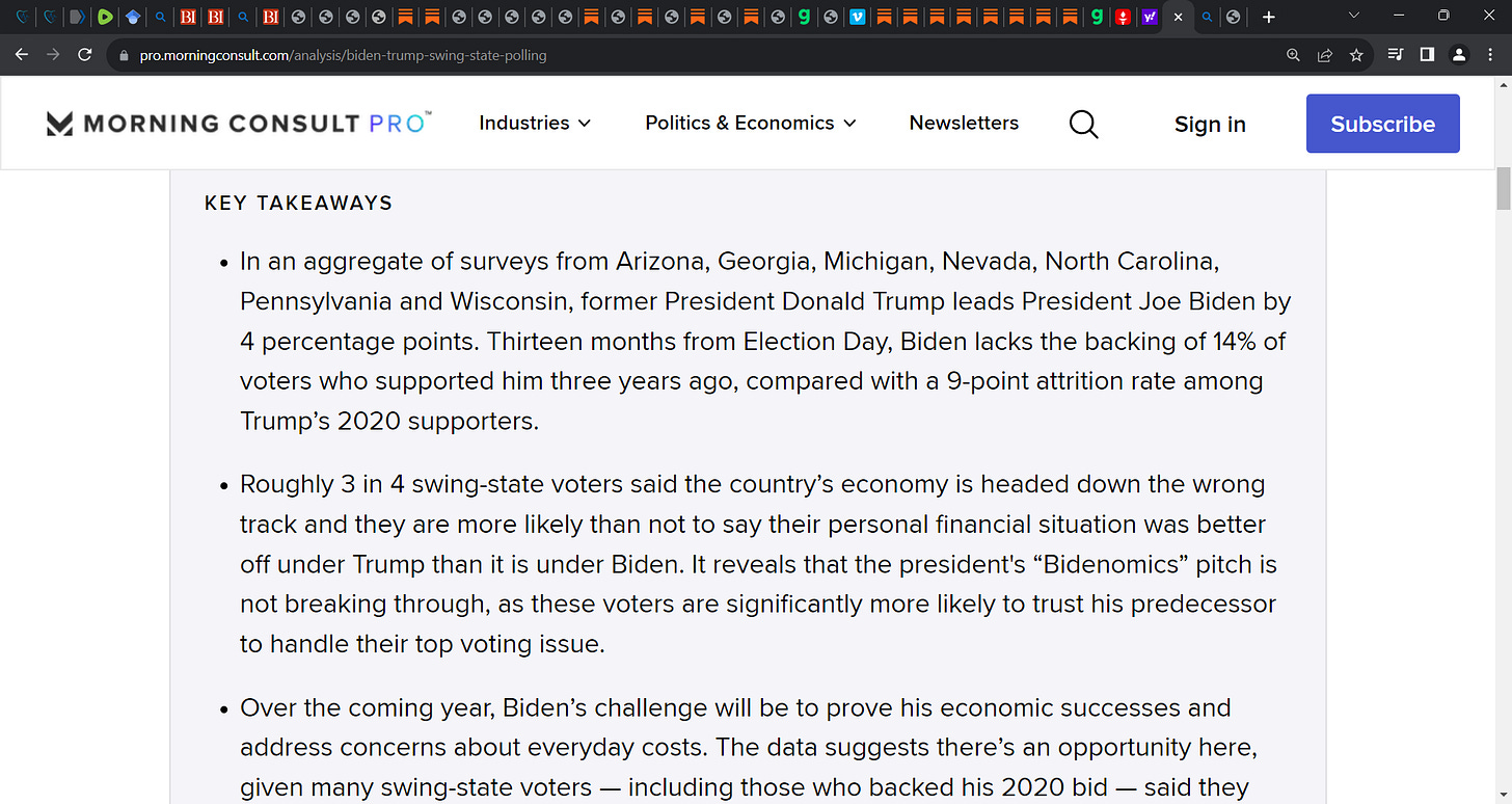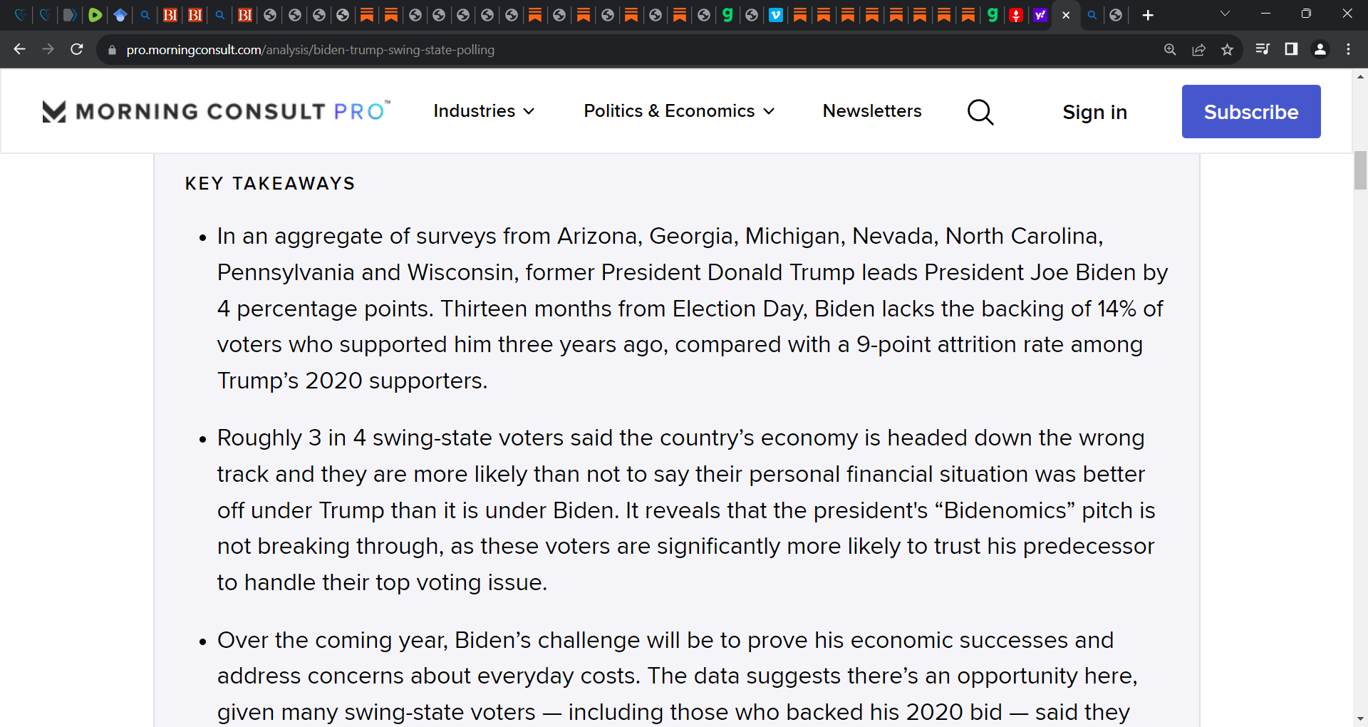 In an aggregate of surveys from Arizona, Georgia, Michigan, Nevada, North Carolina, Pennsylvania and Wisconsin, former President Donald Trump leads President Joe Biden by 4 percentage points.