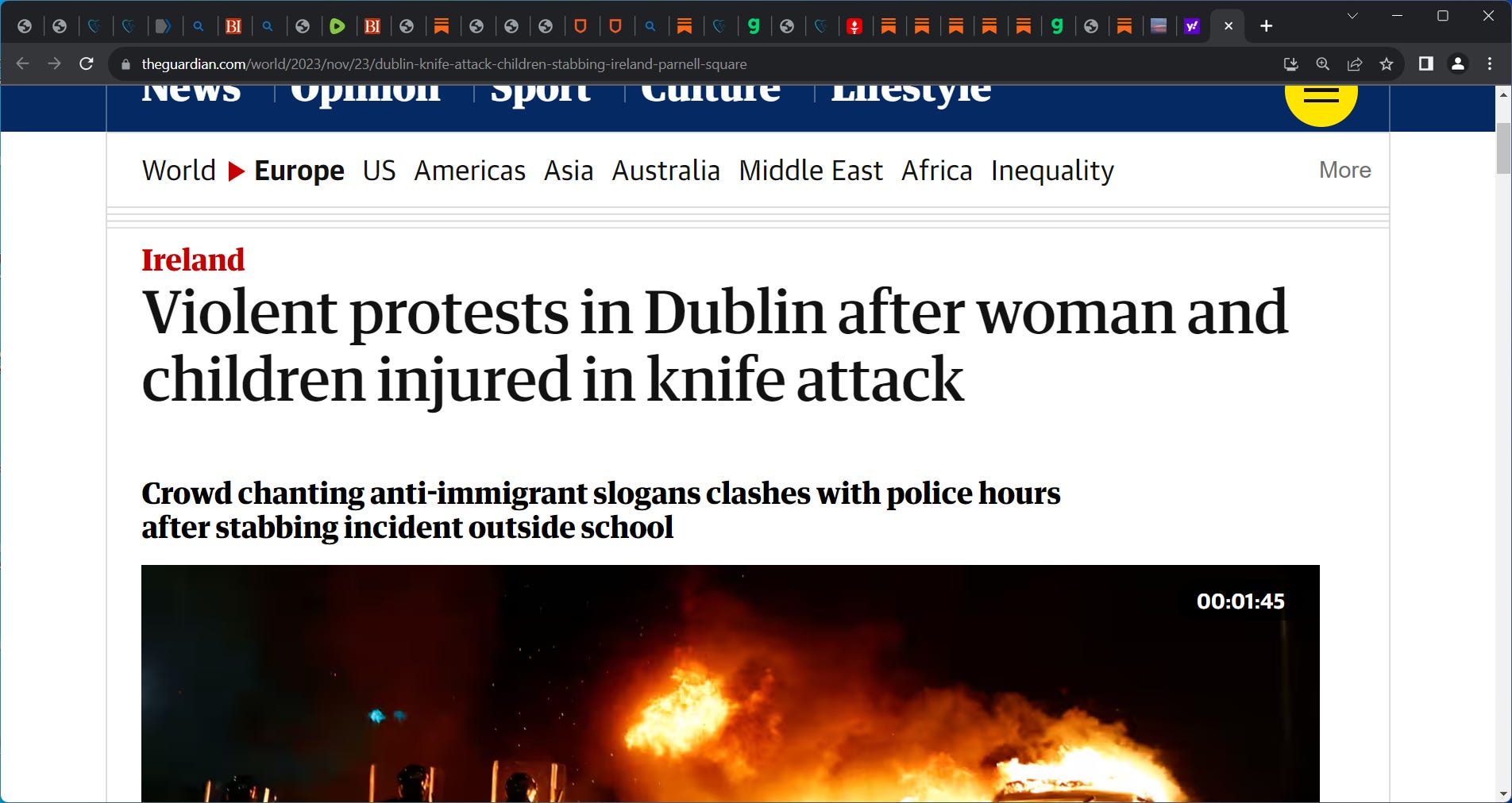 Irish police are questioning an Algerian man suspected of stabbing a woman and three children outside a school; Violent protests in Dublin after woman and children injured in knife attack