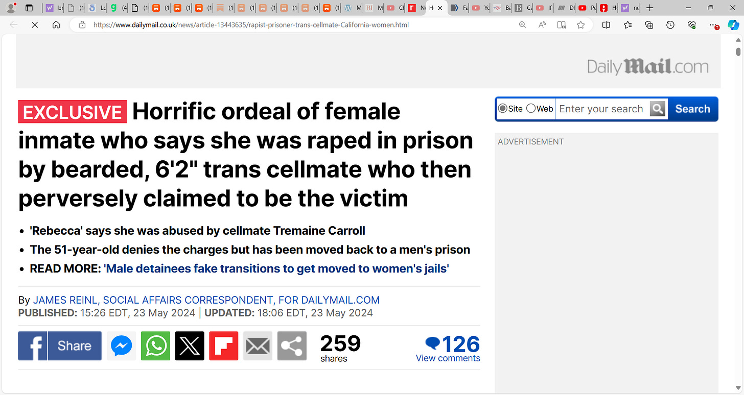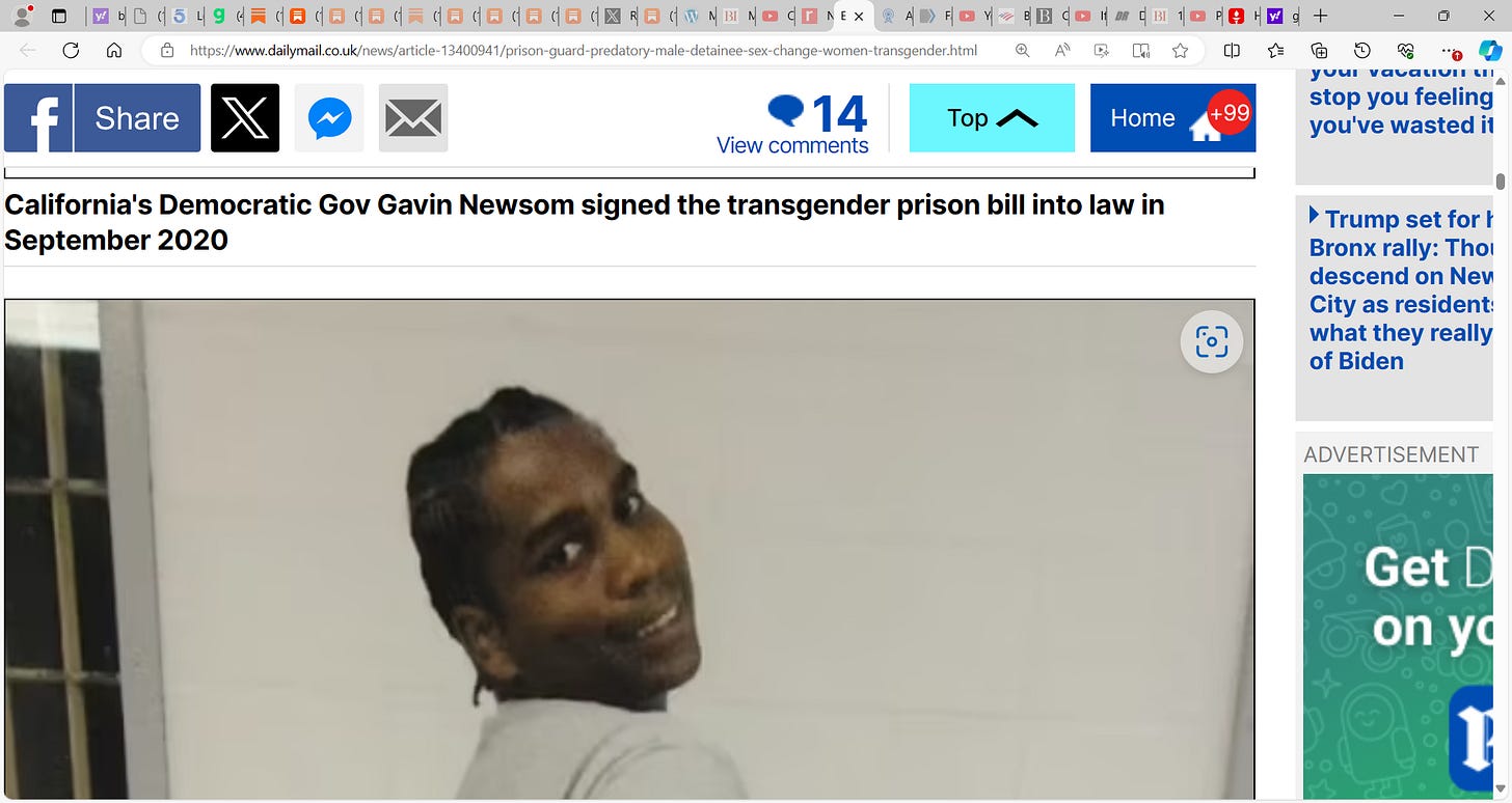 Do you understand the insanity here? Does this madman slick back hair Newsom not understand now rapes are rising dramatically, female prisoners getting pregnant, abused, beaten etc. by tranny men with penises. Due to his policies…