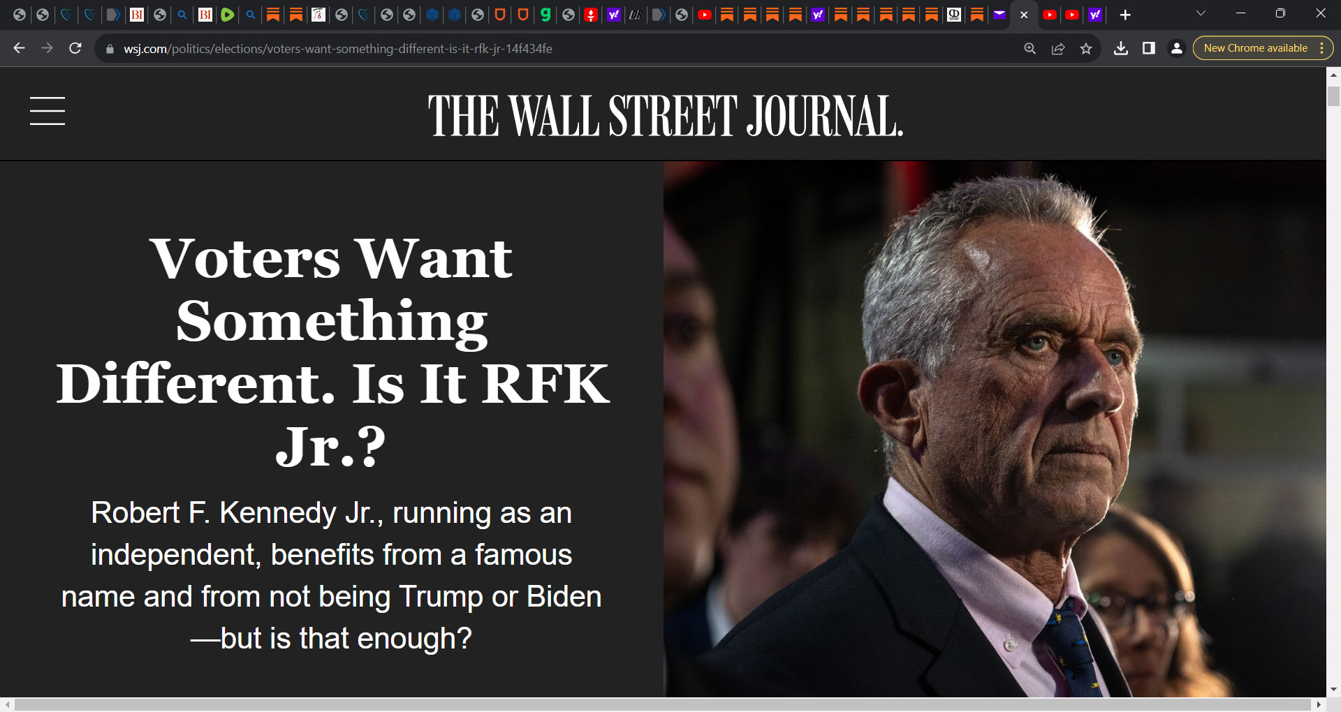 Is it Bobby Jr.? "Voters Want Something Different. Is It RFK Jr.? Robert F. Kennedy Jr., running as an independent, benefits from a famous name and from not being Trump or Biden—but is that enough?