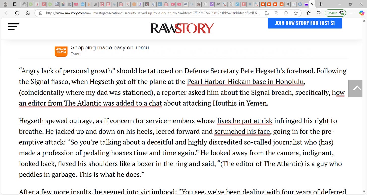 Paul , you are yet again falling for these crappy hit jobs on SecDef Hegseth. I had heard the audio of this exchange in Hawaii with the so-called reporter ,and thought Mr. Hegseth handled the insulting nature of the redundant questioning very well. In fact I thought he was more diplomatic than he needed to be with her snide implication that he must be considering resignation.