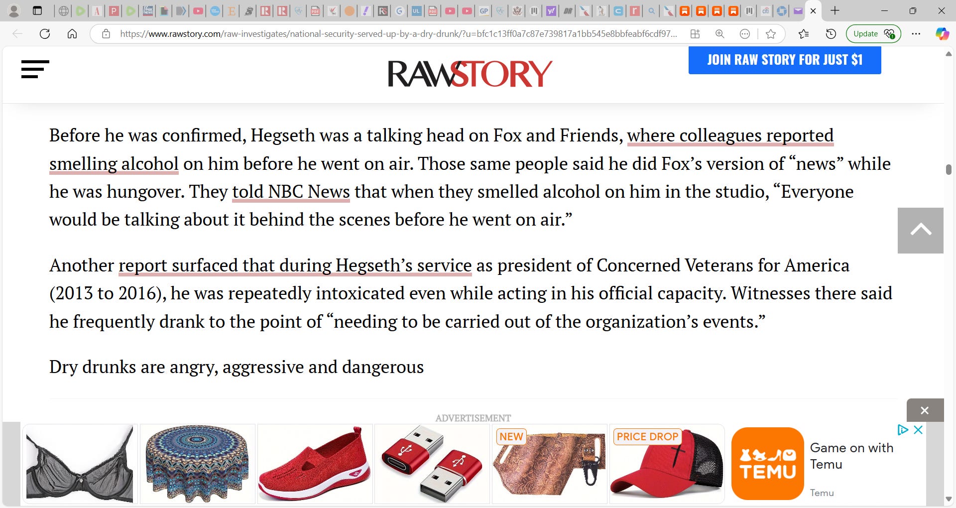 As to the writer , Haake ? , and her personal analysis of Hegseth as a "dry drunk" , to me that is just another democrat snipe job. Like "when did he stop beating his wife?" sort of crap.
