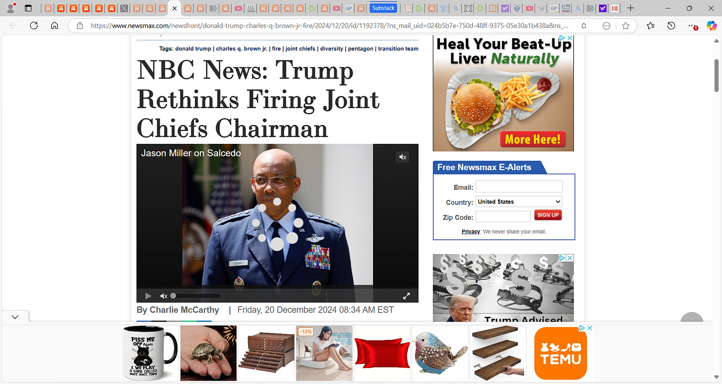 Is POTUS Trump reconsidering firing Joint Chiefs Chairman Air Force Gen. Charles Q. Brown Jr.? Seems after they talked at Saturday's Army-Navy football game in Landover, Maryland, the 2 men made NICE!