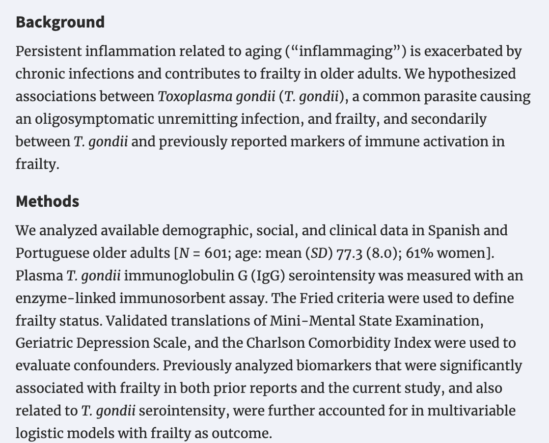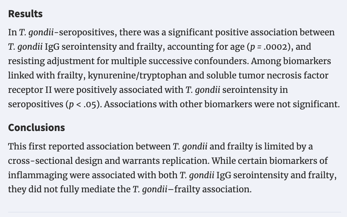 The study looked at 601 elders and found a correlation between the biomarkers for “frailty” and antibodies against Toxoplasma gondii, a small intercellular parasite that is related to the bug that causes malaria, very prevalent in the west, and at the moment rather under-appreciated by the learned men. (It is under-appreciated because there is no vaccine to sell yet. They’ll tell us as soon as they come up with a $hitty vaccine to sell. And it’ll be extremely tragic as the “toxo epidemic” is real in my opinion (along with an epidemic of other non-viral under-the-radar bugs like molds, other fungi, etc.) but, as it goes, their new vaccine will only maim. And, God, I looked at some of the toxo vaccines they are working on, a conversation for another day but it made my hair stand up.)