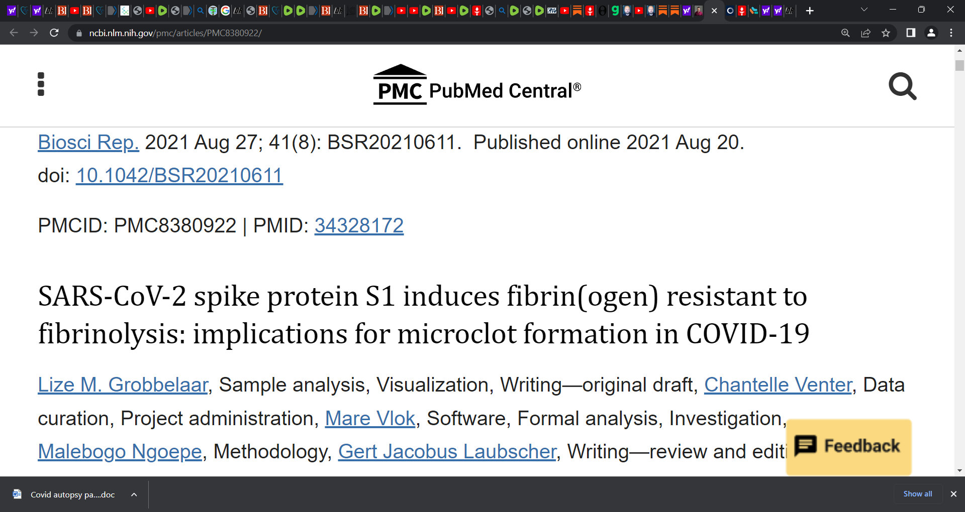Is the COVID virus spike protein S1 sub-unit (& thus mRNA technology vaccine induced spike) capable of inducing fibrin(ogen) resistant to fibrinolysis? Yes, Grobbelaar et al.'s research tells us this;