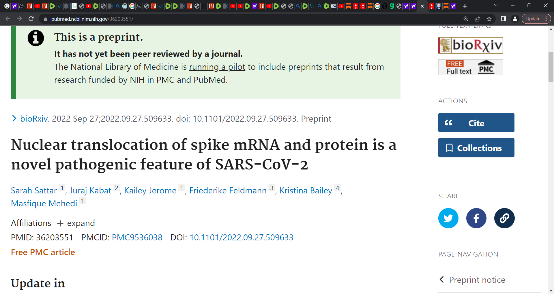 Is there nuclear (nucleus) translocation of COVID spike mRNA & protein? Sattar et al. says yes & reports one of the novel sequence insertions resides at the S1/S2 boundary of Spike (S) protein and
