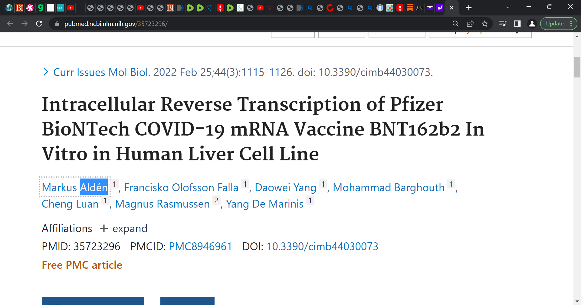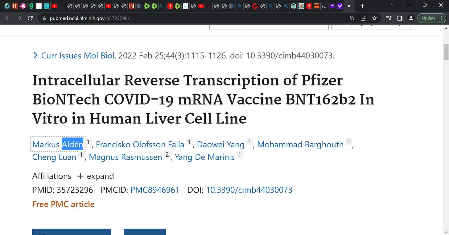 Is there reverse transcription of Pfizer mRNA into DNA? Yes, evidence: (Alden)- “BNT162b2 (Pfizer) mRNA is reverse transcribed intracellularly into DNA in as fast as 6 hours upon BNT162b2 exposure”