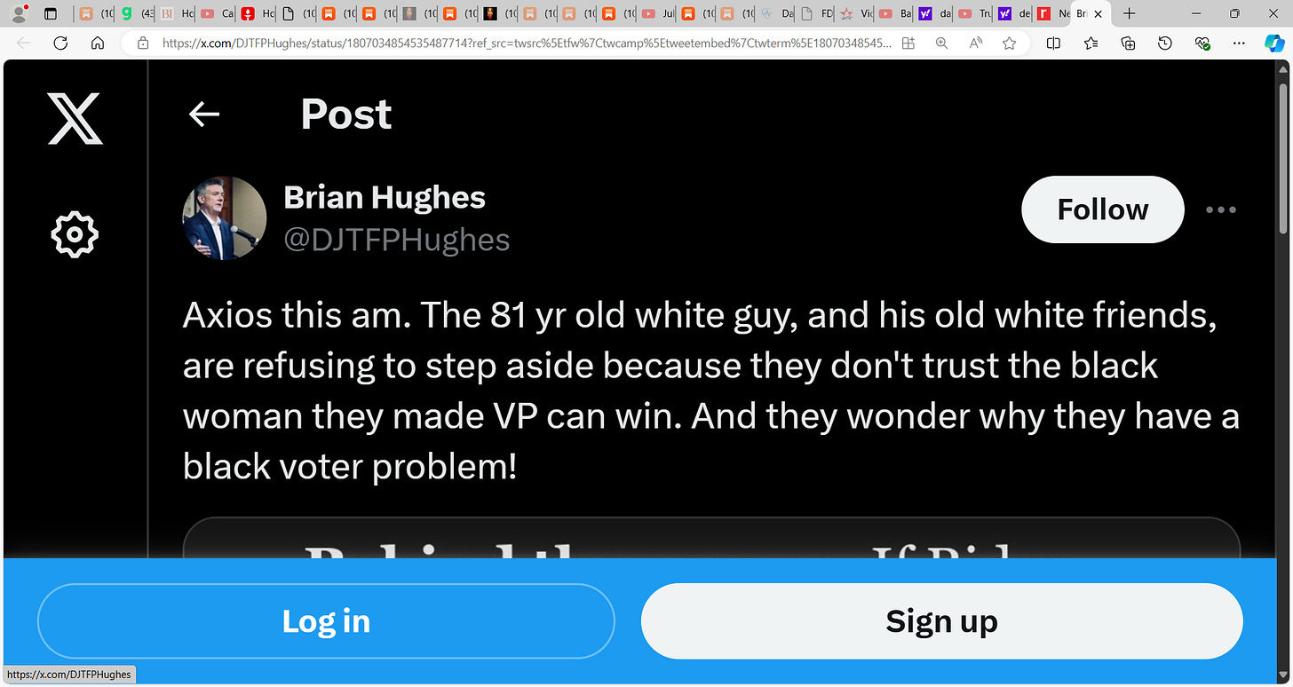 ‘Axios this am. The 81 yr old white guy, and his old white friends, are refusing to step aside because they don't trust the black woman they made VP can win. And they wonder why they have a black voter problem!’