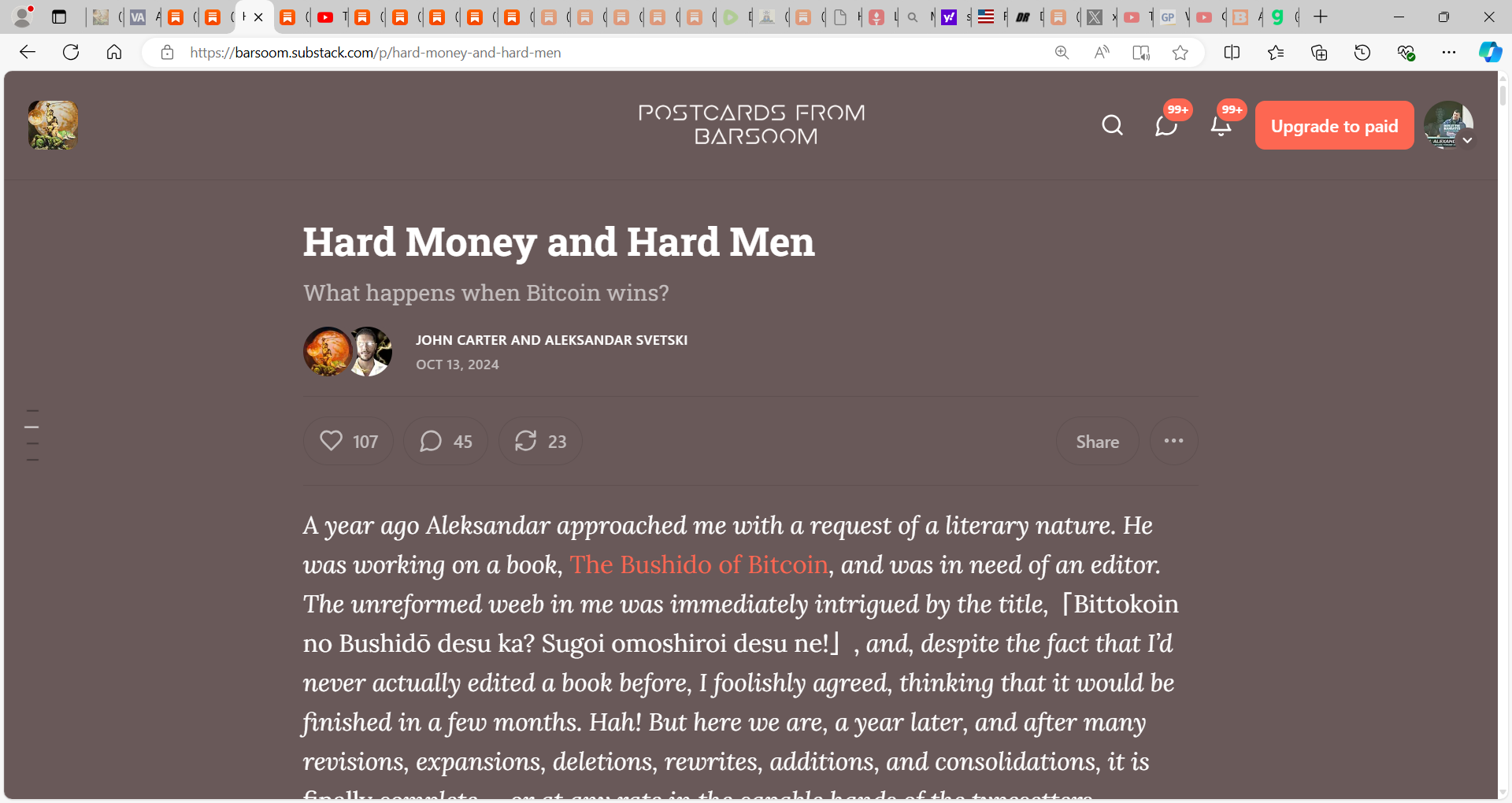 Despite the title, The Bushido of Bitcoin is not a book is not about Bitcoin, but about virtue. Bitcoin merely provides a solid and honest base layer for civilization. The book is a playbook for a new socio-economic standard. It’s a moral code for the victors of the future. The book is about the sort of qualities and behaviors future leaders will have to embody and practice once shit hits the fan, so that we may rebuild a life-affirming civilization from the ashes of clown world.