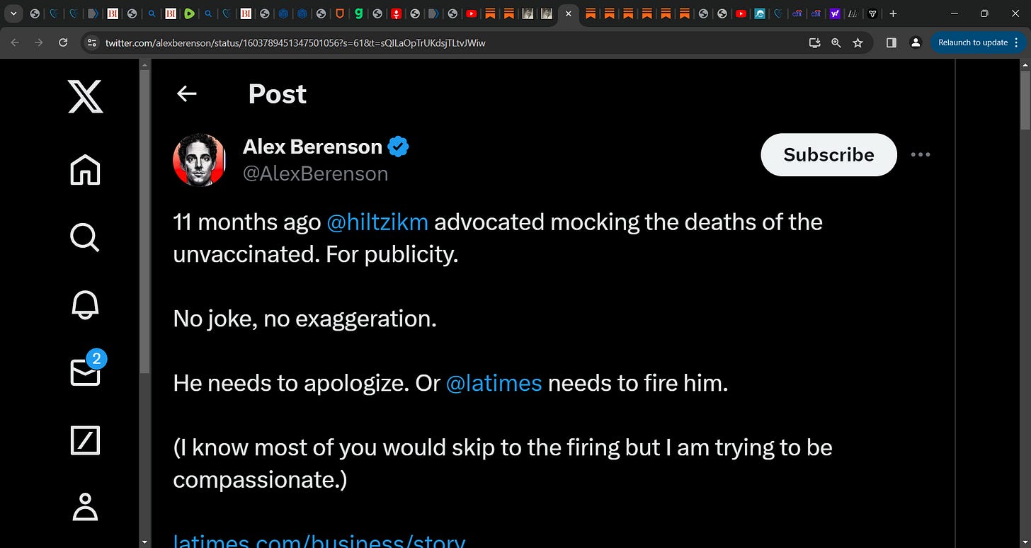 People I admire like Howard Stern, David Frum, Sean Penn, Jim Cramer, Alan Dershowitz, Gene Simmons, Arthur Caplan, Joy Behar, Michael Hiltzik, Geraldo Rivera, Jennifer Rubin, Brian Stelter, Jimmy Kimmel, Heather Mallick, Randi Weingarten, Paul Krugman, Noam Chomsky, Max Boot, Jeff Zucker, Mark Cuban, Andy Slavitt, Emily Oster, Doug Little, Dee Snider, Tim Wise, Jerry Saltz, and also Susan Michie and Mark Slapinsky are saying my family and I should die, have our deaths mocked, or not be able to work, go to school, or get food or medical treatment — including an ICU bed or a ventilator — if we get Covid but don’t take their leaky vaccines and every booster they tell us to take forever.