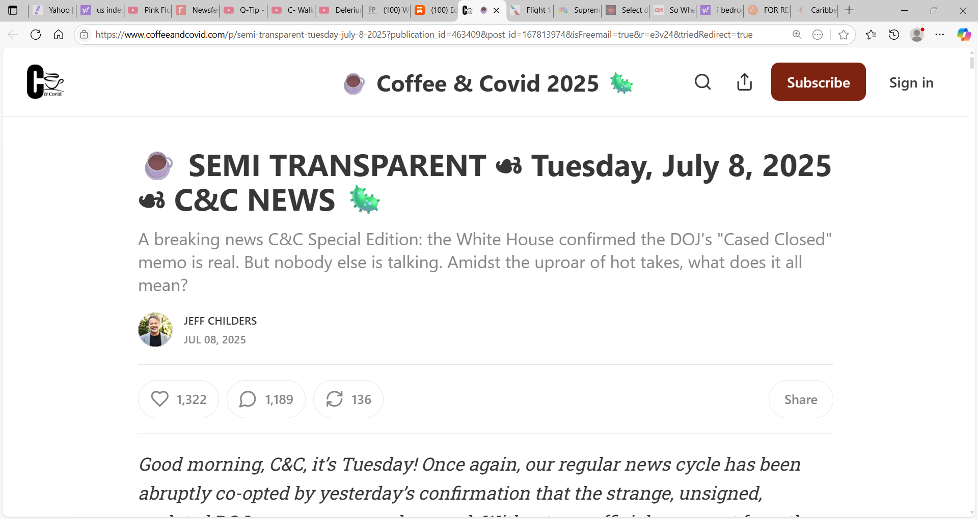 Yes Paul, Jeff Childers Coffee & Covid Substack is awesome. I only discovered him a couple years ago. He is an attorney in FL, and has had some high profile cases. He is a brilliant writer, and has a great sense of humor which he infuses into his Substack. I look forward to it each morning. If one can leave an early comment it can be read by hundreds of his readers. And his readers are so intelligent as well, and share so much knowledge.