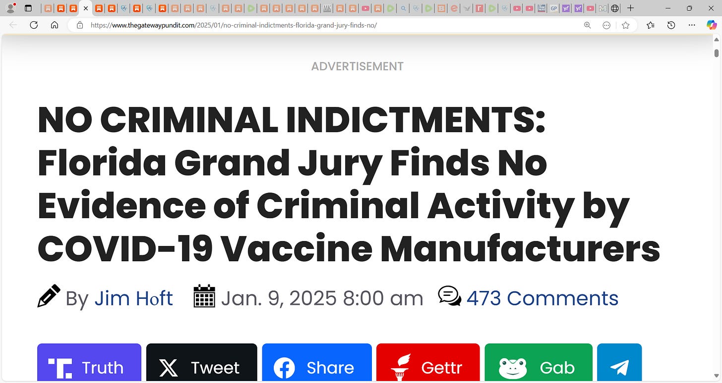 Jim Hoft Gateway again seminal reporting, showcasing the criminal of the judicial system even in DeSantis Florida where Malone Bourla Bancel et al. mRNA gene injections get away FREE "NO CRIMINAL