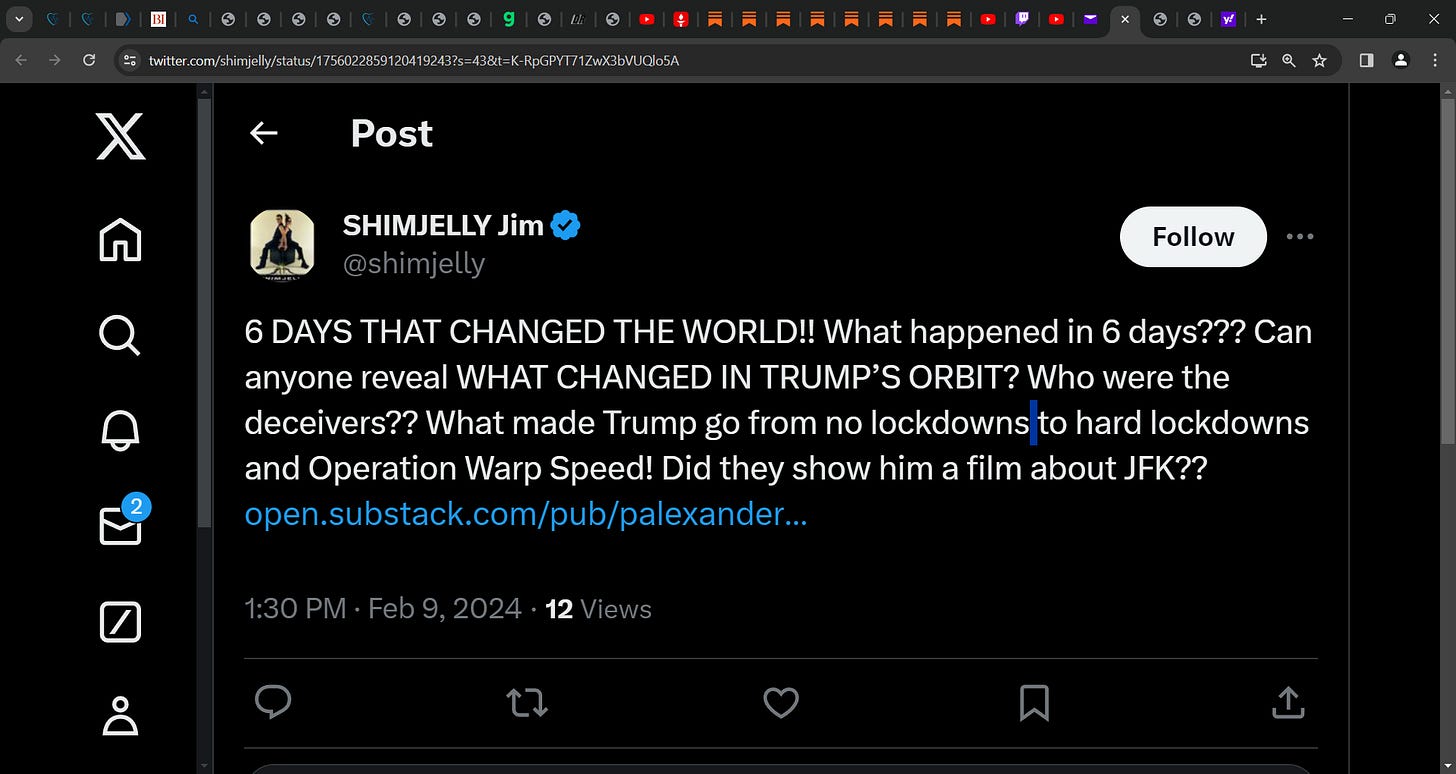 Jim Torma on Twitter asks a serious question, as to the 6 days that changed the world...was POTUS Trump threatened? what is Torma insinuating? was Trump's life threatened to lockdown? did they threat-