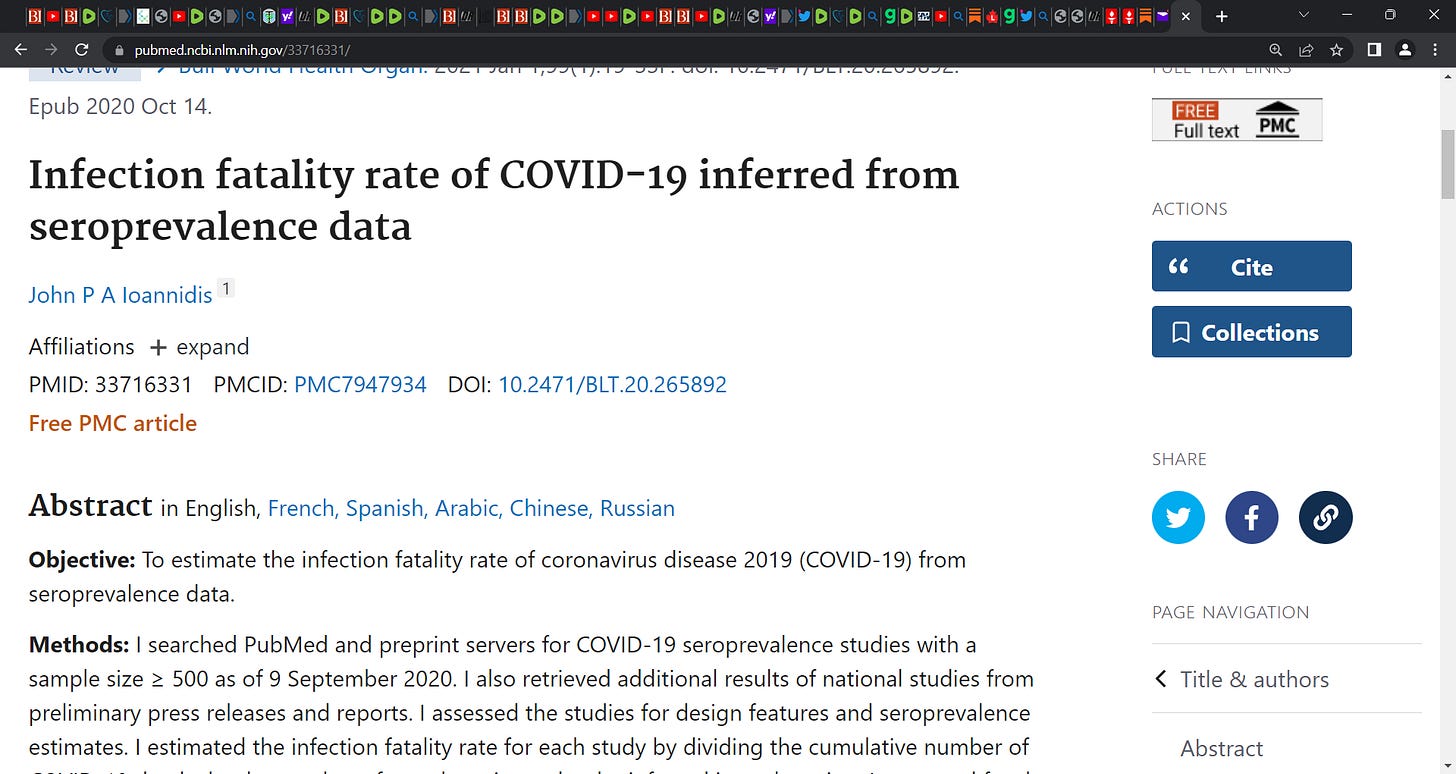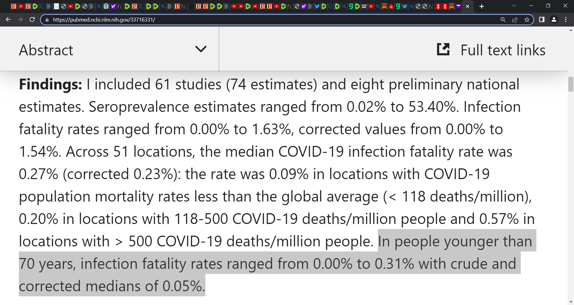 John Ioannidis in 2020 told us that in people under 70 years, infection fatality rate (IFRs) ranged from 0.00% to 0.31% with crude & corrected medians of 0.05%; I say again, 0.05%, kids 0-19 (0.0003%)