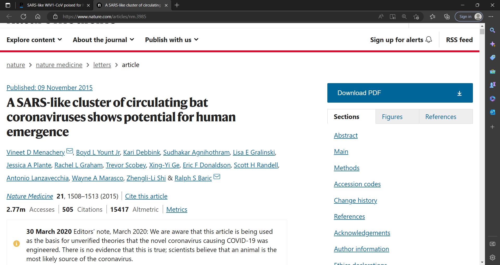 These two papers show the close tie between Chinese and America researchers collaborating to make SARS-CoV viruses through deadly and illegal gain-of-function research. With NIH and US researchers and Fauci and Francis Collins hands all over it. I include them again, reminded by Dr. Breggin and here are the abstracts and use these 2 studies for legal purposes and for your libraries as these 2 are key as to how we got here. IMO, I believe strongly that a leak occurred surrounding this research by Menachery and Baric funded by NIH. It may have even happened on US soil.