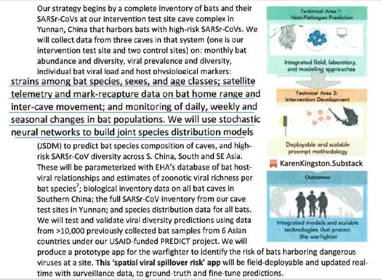 EcoHealth states they have been using a satellite tracking system to track the bats’ movements when they are in their ‘bat homes’, as well as to track them when they leave their ‘bat homes.’ I assume this means the US military can track the vaccinated bats when they to go to their bat offices, bat school campuses, bat gyms, or their local bat-bar happy hour.