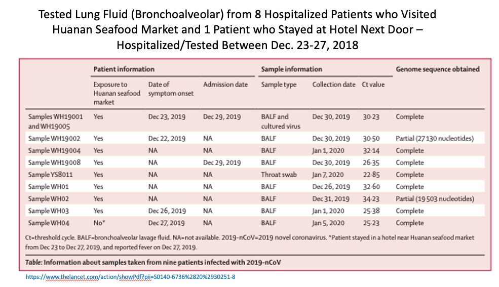 Speaking of suspicion, this article published in the Lancet released the genetic sequences from the first 9 patients infected at the Wuhan Seafood market inoculated with SARS-CoV-2. This is ground zero. If you read the article, there were already variations identified in the first 9 patients. It’s evolutionary impossible for a virus to mutate on the same day of the 1st infections.