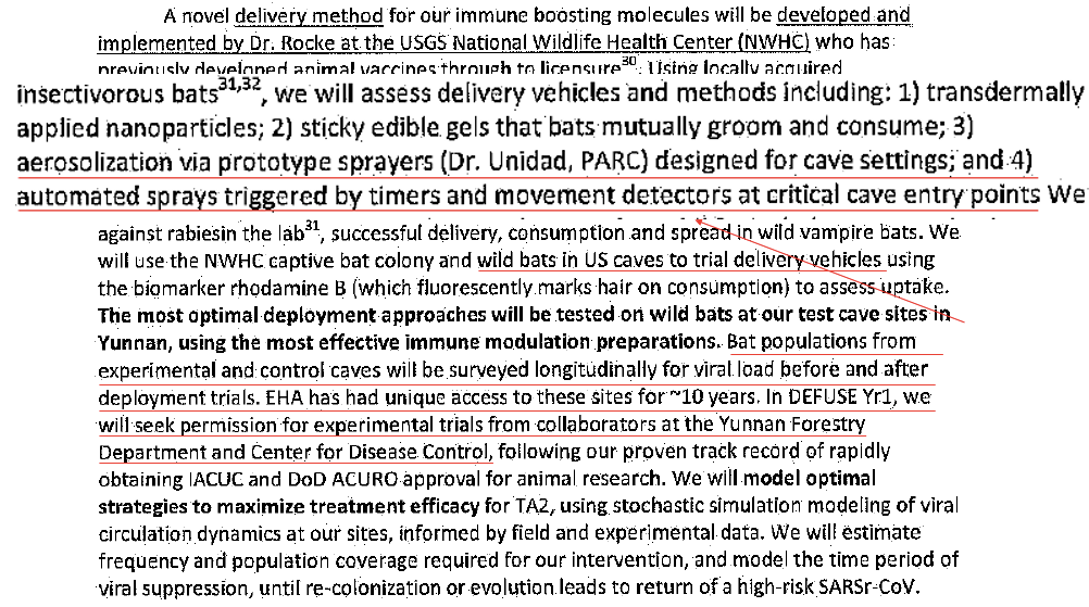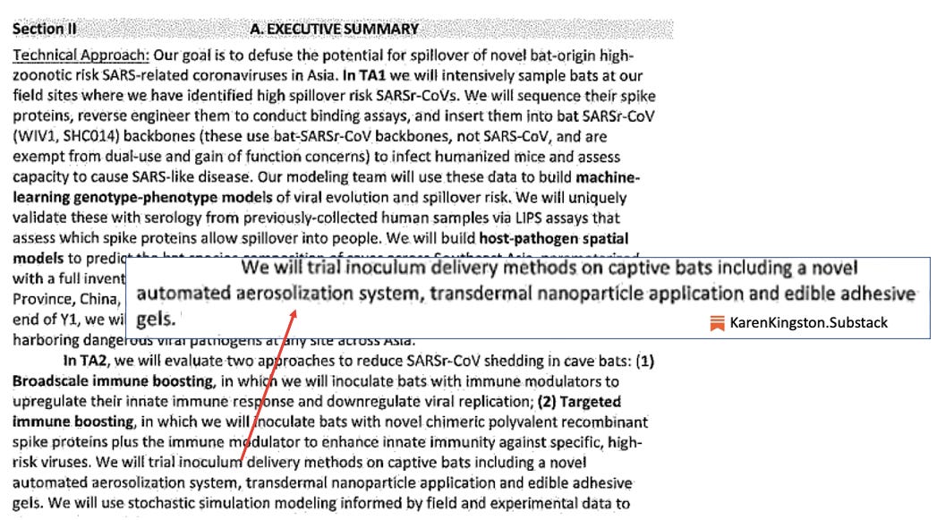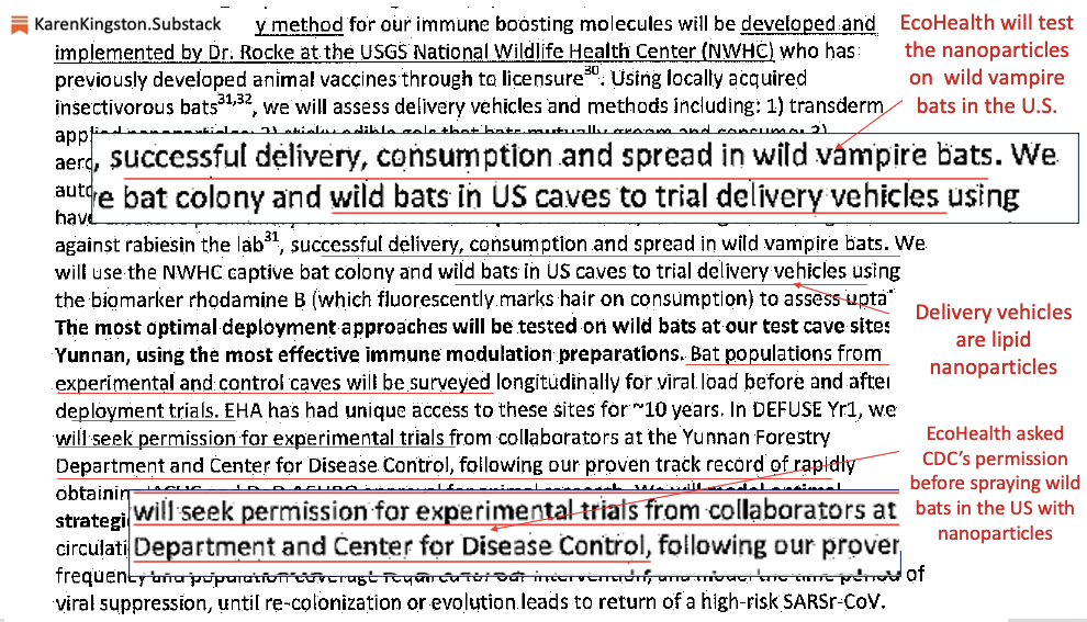 EcoHealth states that they will use aerosol and surface, food and beverage (ice) contamination to inoculate ‘wild vampire bats’ in the United States with non-mRNA lipid nanoparticles after seeking permission from the CDC. The CDC is named as a co-conspirator in this planned attack on humanity.