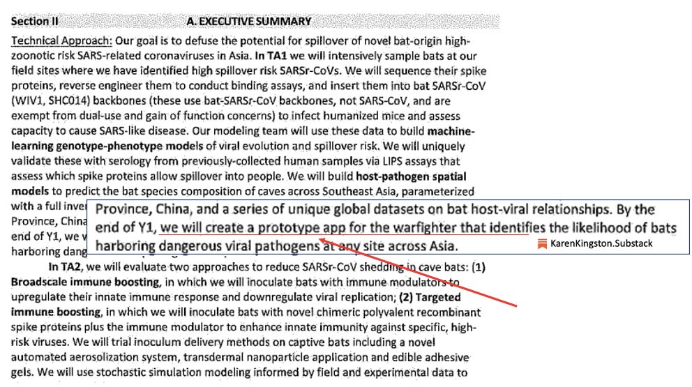 As we continue to go through the proposal to DARPA, it should be apparent to any adult with a reading comprehension level above a 5th grader that EcoHealth Alliance isn’t talking about vaccinating ‘bats’. The March 2018 proposal is the plan to release mRNA nanoparticle bioweapons on human beings; human beings that are citizens of China and the United States.
