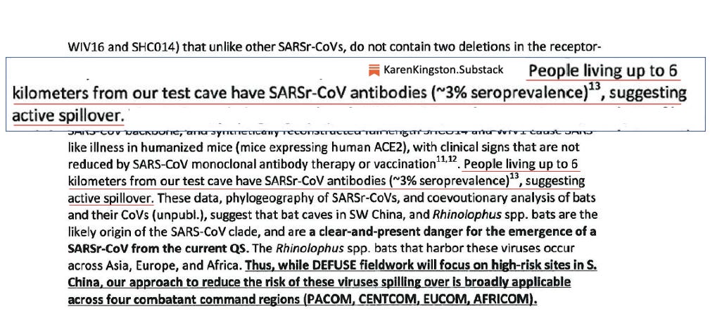 EcoHealth claims that there was a ‘spillover effect’ with 3% of people who live up to 6 kilometers from the vaccinated bat caves developing SARS-CoV-2 antibodies. In other parts of this document, EcoHealth mentions up to a 10% spillover effect of local populations near bat caves.