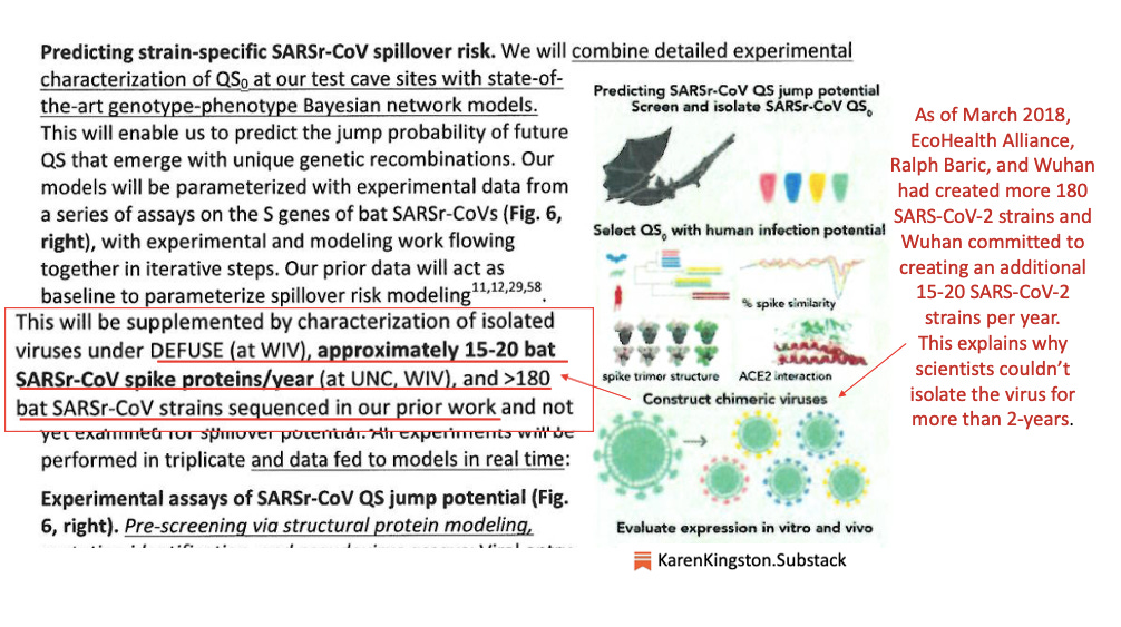 Per EcoHealth’s pitch to DARPA (Defense Advanced Research Projects Agency), Ralph Baric (who has received over $100mm in NIH gain-of-function funding through the University of North Carolina, EcoHealth, et al.) led the EcoHealth team of scientists who created weaponized SARS-CoV-2 spike proteins and incorporated them into (mRNA) nanoparticles.