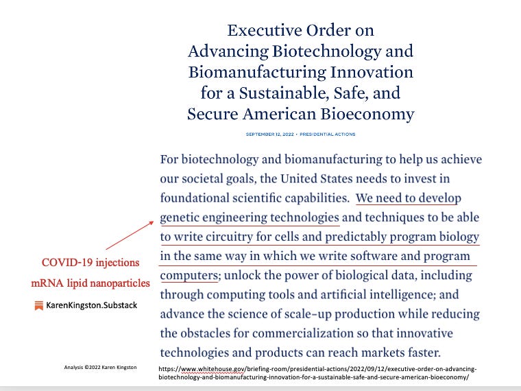 Biden made the US government’s mission clear in his September 12, 2022, Executive Order. The US government is invested in and dedicated to ensuring that gene-editing technologies are in the bodies of every US adult and child in order to, “write circuitry for cells and predictably program biology in the same way we write software programs for computers.”