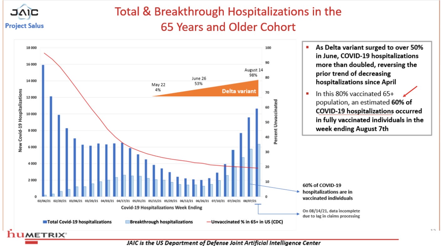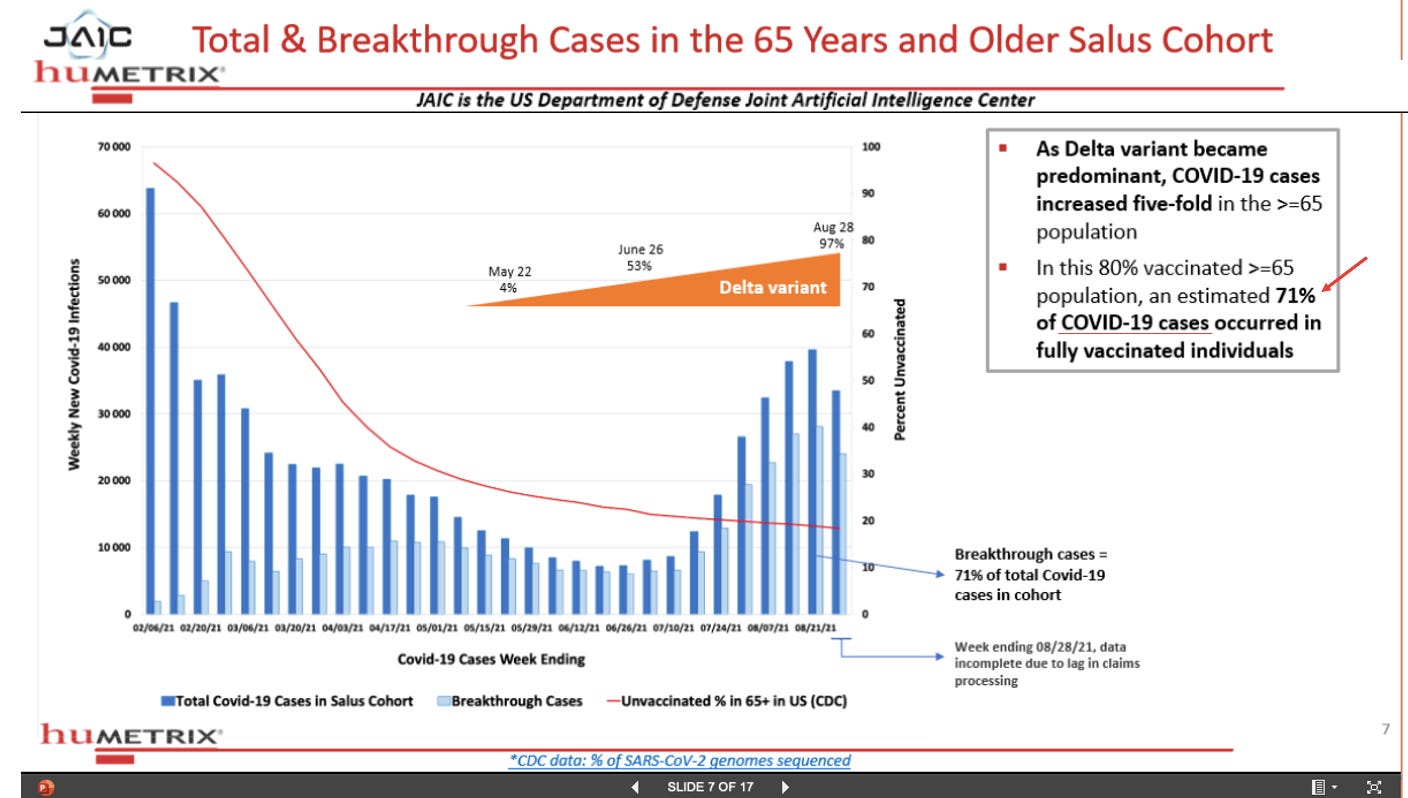 As of September 28, 2021, data collected by the Joint Artificial Intelligence Center (JAIC) of the U.S. Department of Defense (DoD), demonstrated that among 5.6 million Medicare beneficiaries 65 years and older who received Pfizer’s or Moderna’s mRNA nanoparticle technology injections or remained non-injected;