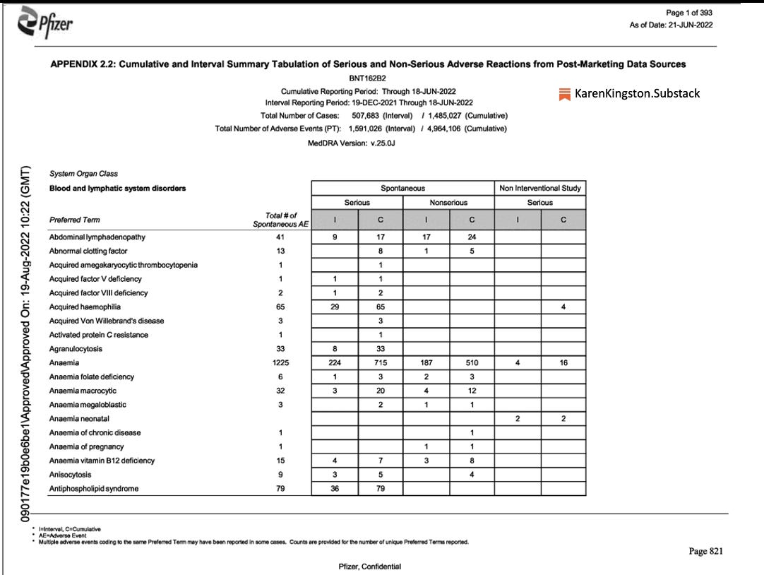 Per a June 21, 2022, internal Pfizer document, Pfizer has documented approximately 5 million injuries, diseases, disabilities and/or deaths from approximately 1.5 million patients, each patient reporting on average 3- 4 harmful effects, including;