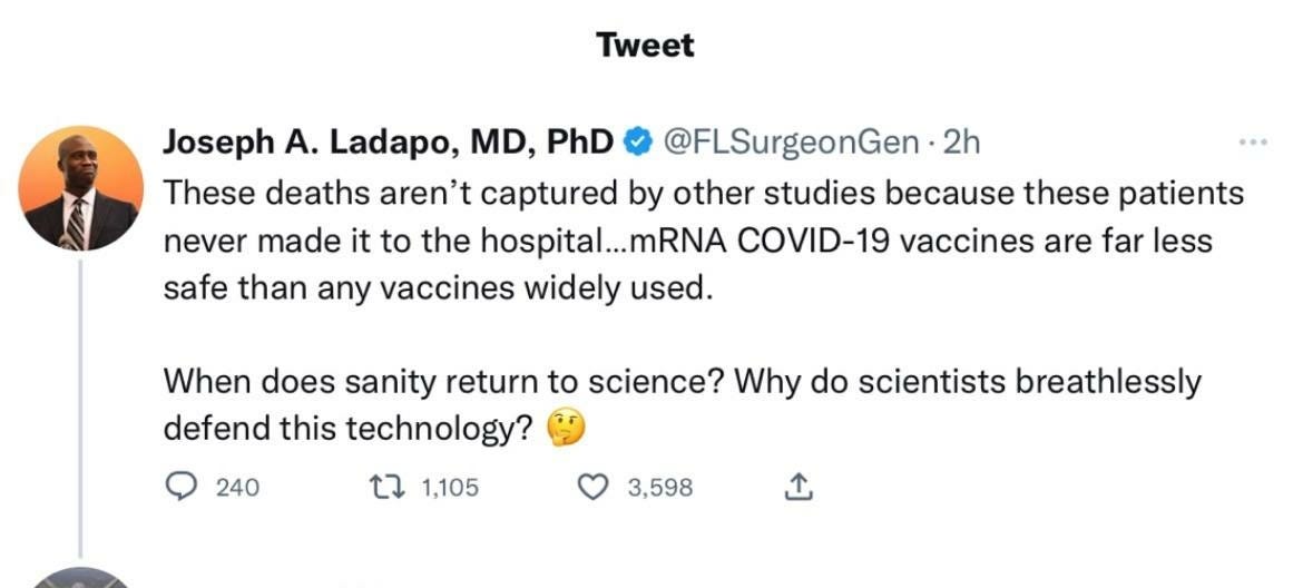Ladapo for the WIN! again! Courageous Dr. Joe Ladapo; mRNA vaccines are far less safe than any other vaccines! Thank you Dr. Ladapo, you are our John Galt (Atlas Shrugged)
