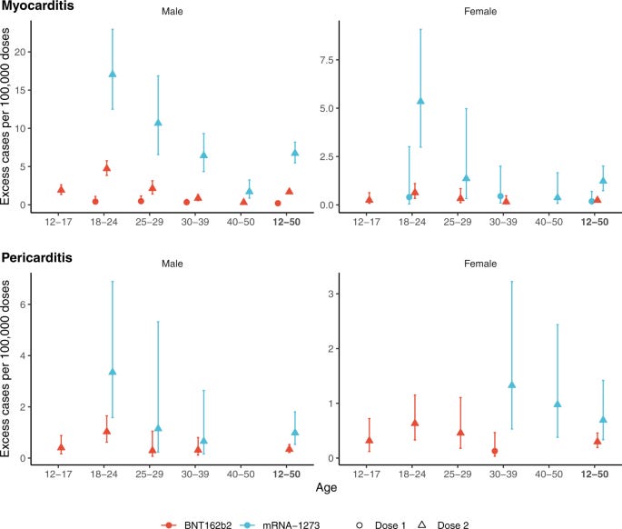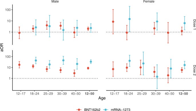 ‘matched case-control studies and find increased risks of myocarditis and pericarditis during the first week following vaccination, and particularly after the second dose, with adjusted odds ratios of myocarditis of 8.1 (95% confidence interval [CI], 6.7 to 9.9) for the Pfizer BioNTech (BNT162b2) and 30 (95% CI, 21 to 43) for the Moderna (mRNA-1273) vaccine. The largest associations are observed for myocarditis following Moderna mRNA-1273 vaccination in persons aged 18 to 24 years. Estimates of excess cases attributable to vaccination also reveal a substantial burden of both myocarditis and pericarditis across other age groups and in both males and females.’