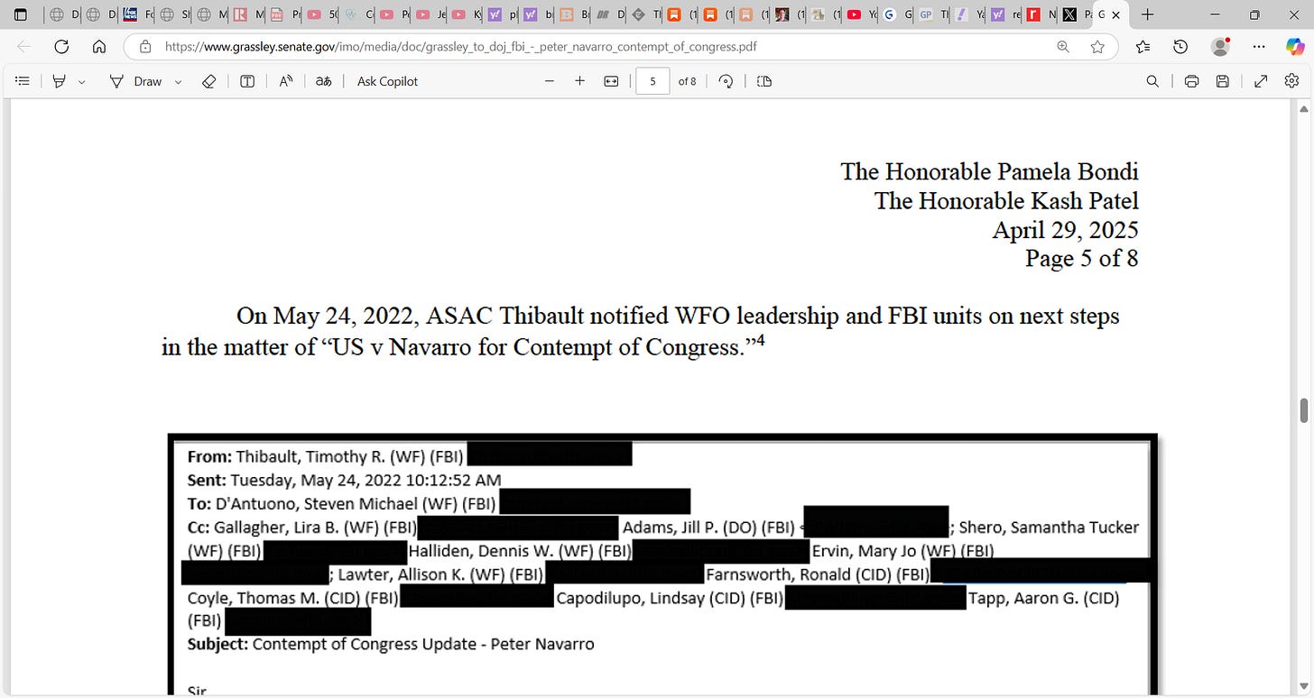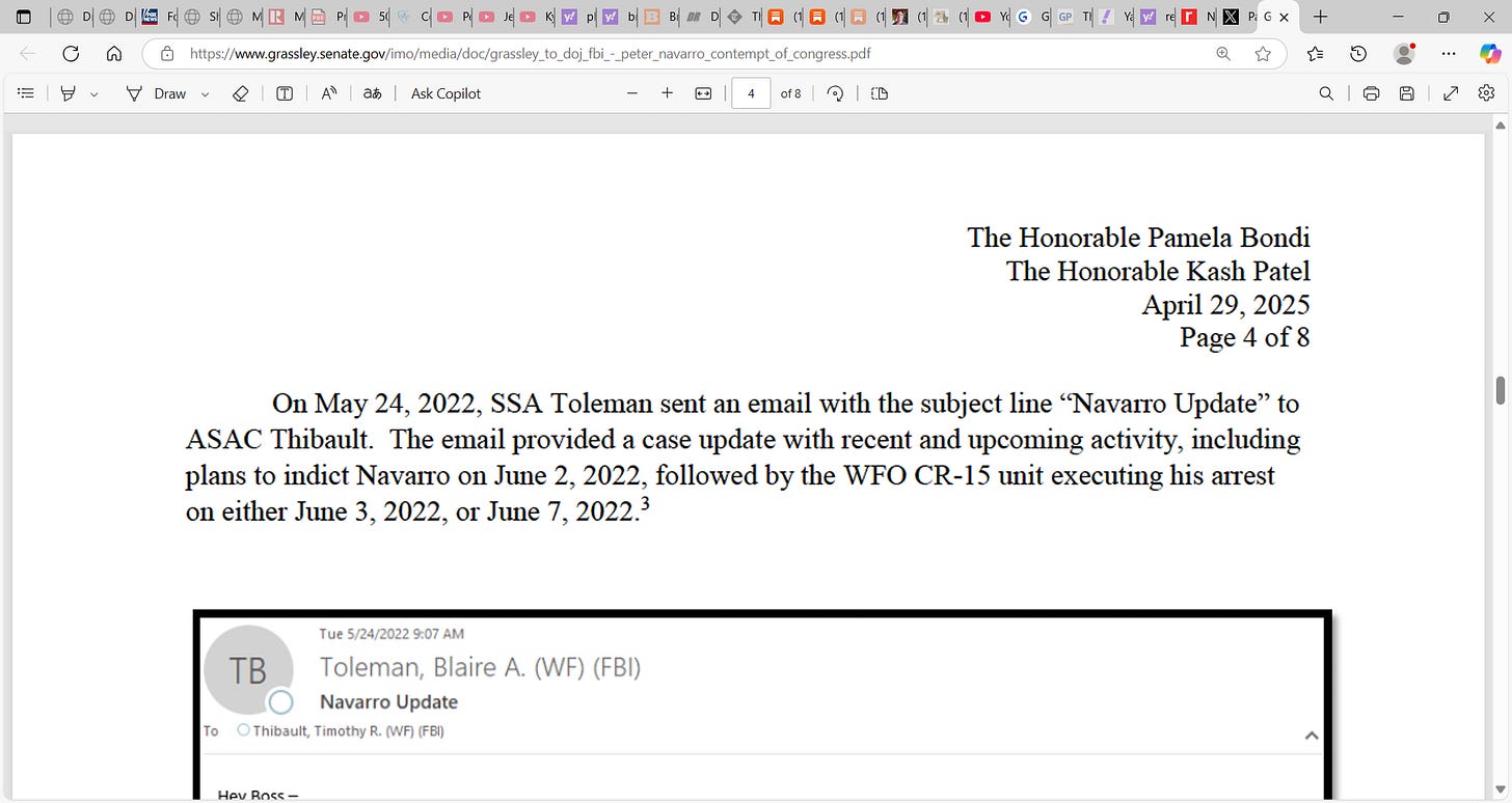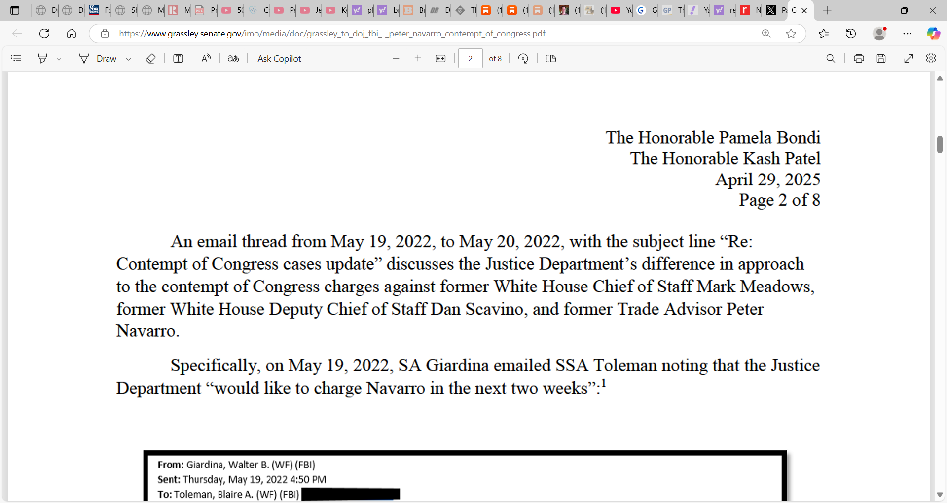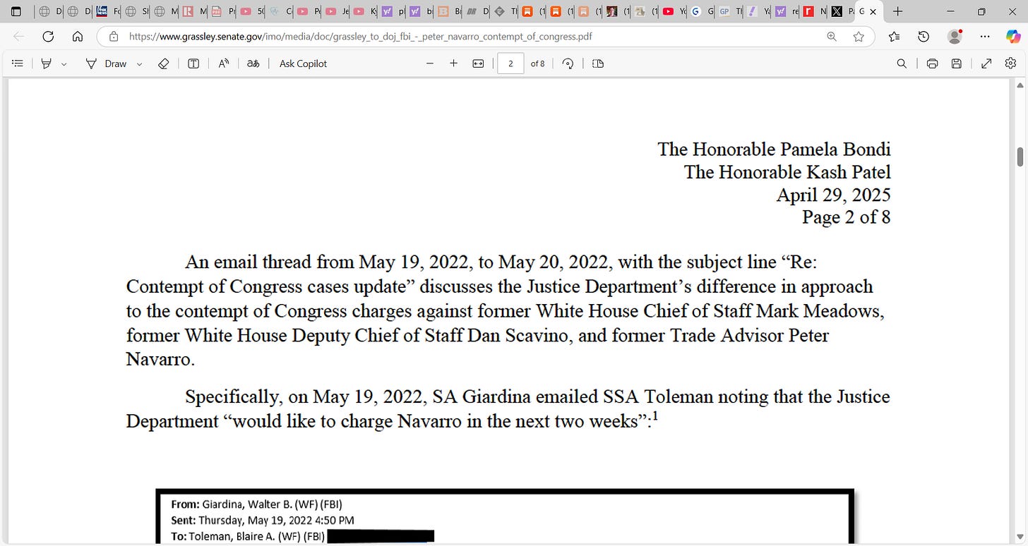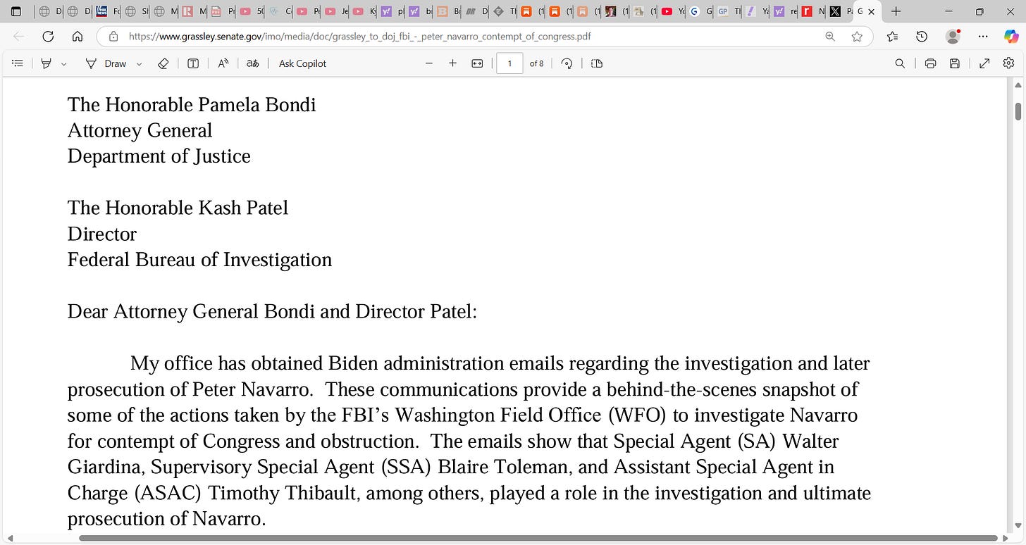 down; this was monstrous what did to Navarro; Senator Chuck Grassley wrote to AG Bondi and FBI's Kash Patel wanting the US population to read the Biden administration's internal workings on this