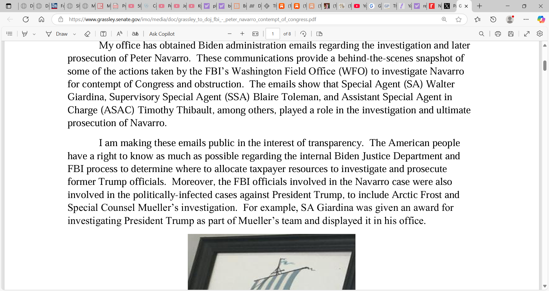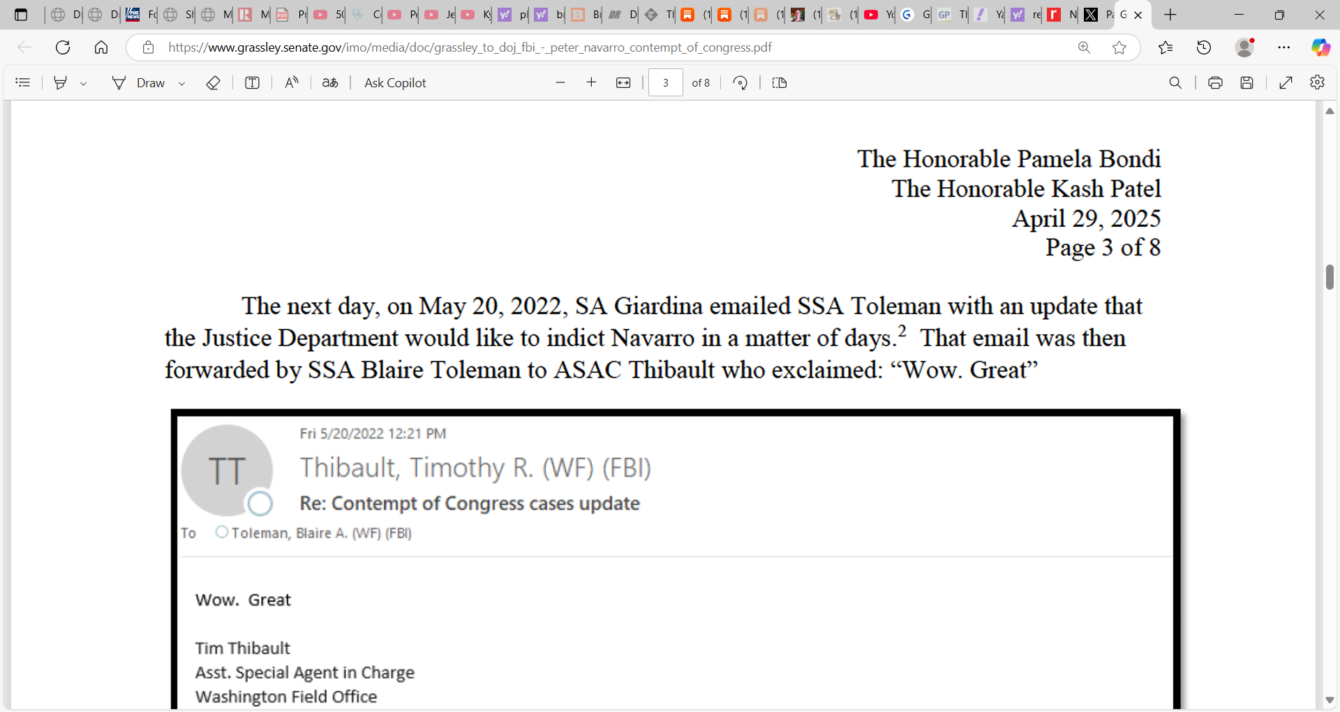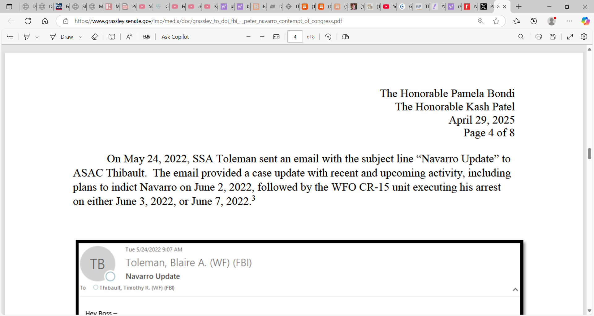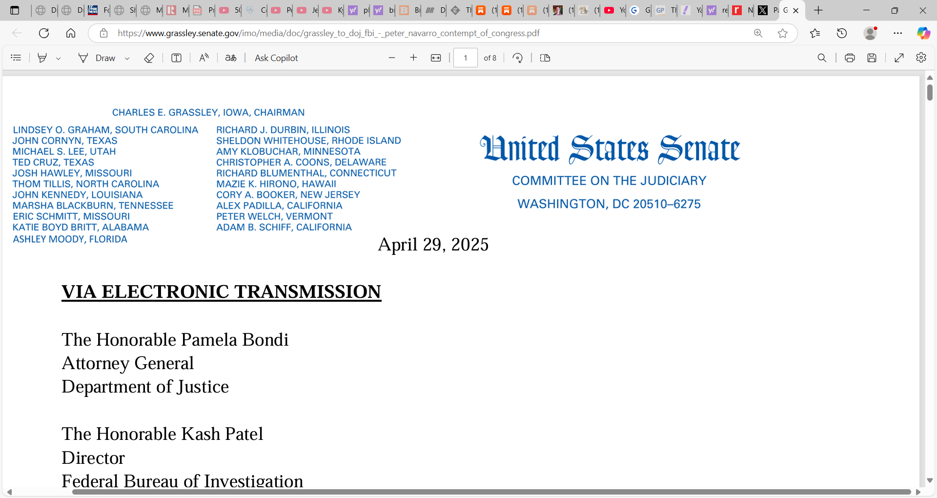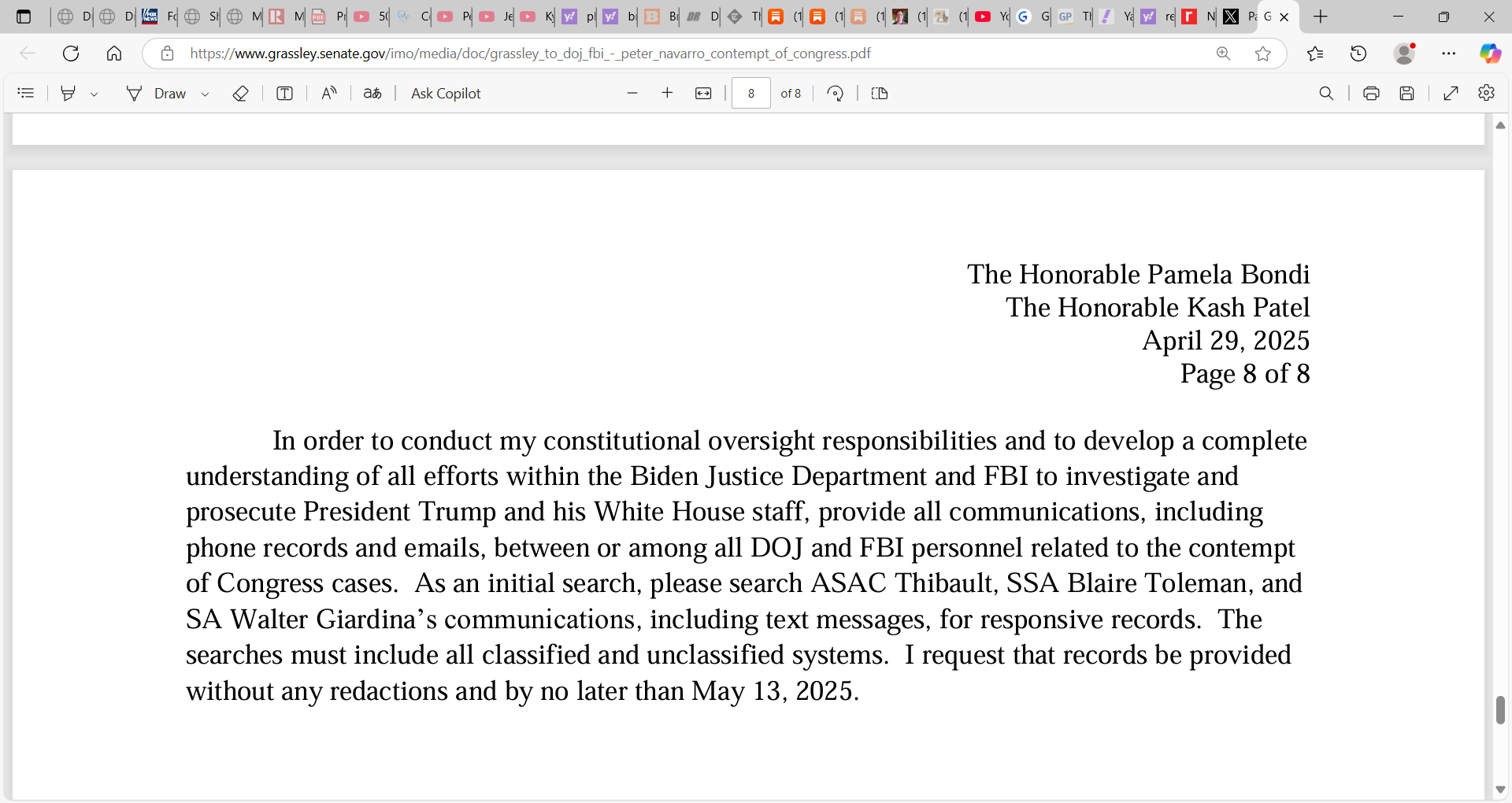 down; this was monstrous what did to Navarro; Senator Chuck Grassley wrote to AG Bondi and FBI's Kash Patel wanting the US population to read the Biden administration's internal workings on this