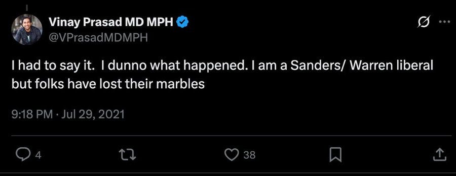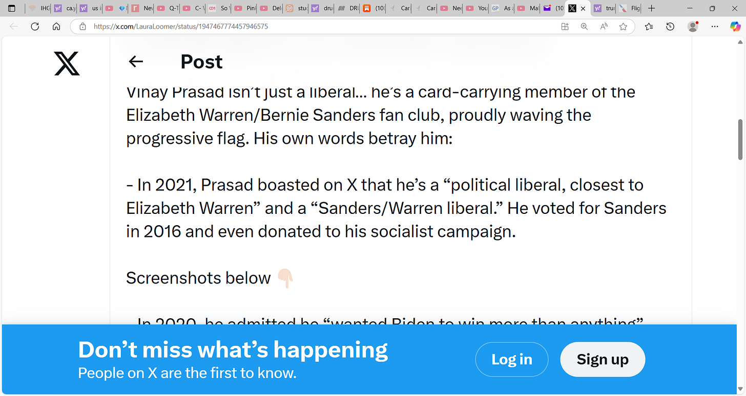 . This is no mere bureaucratic misstep. It’s a catastrophic vetting failure that threatens to derail the America First healthcare revolution. Prasad’s anti-Trump rhetoric, radical left-wing ideology, and deliberate actions to obstruct our President’s deregulatory mission prove he’s a dangerous misfit. The time to act is NOW—Prasad must be REMOVED before he destroys Trump’s vision for a healthier America! Here’s what you need to know about Prasad (who has since blocked me on X for exposing him). A Lifelong Progressive with a Vicious Anti-Trump Record Vinay Prasad isn’t just a liberal… he’s a card-carrying member of the Elizabeth Warren/Bernie Sanders fan club, proudly waving the progressive flag. His own words betray him: - In 2021, Prasad boasted on X that he’s a “political liberal, closest to Elizabeth Warren” and a “Sanders/Warren liberal.” He voted for Sanders in 2016 and even donated to his socialist campaign. Screenshots below