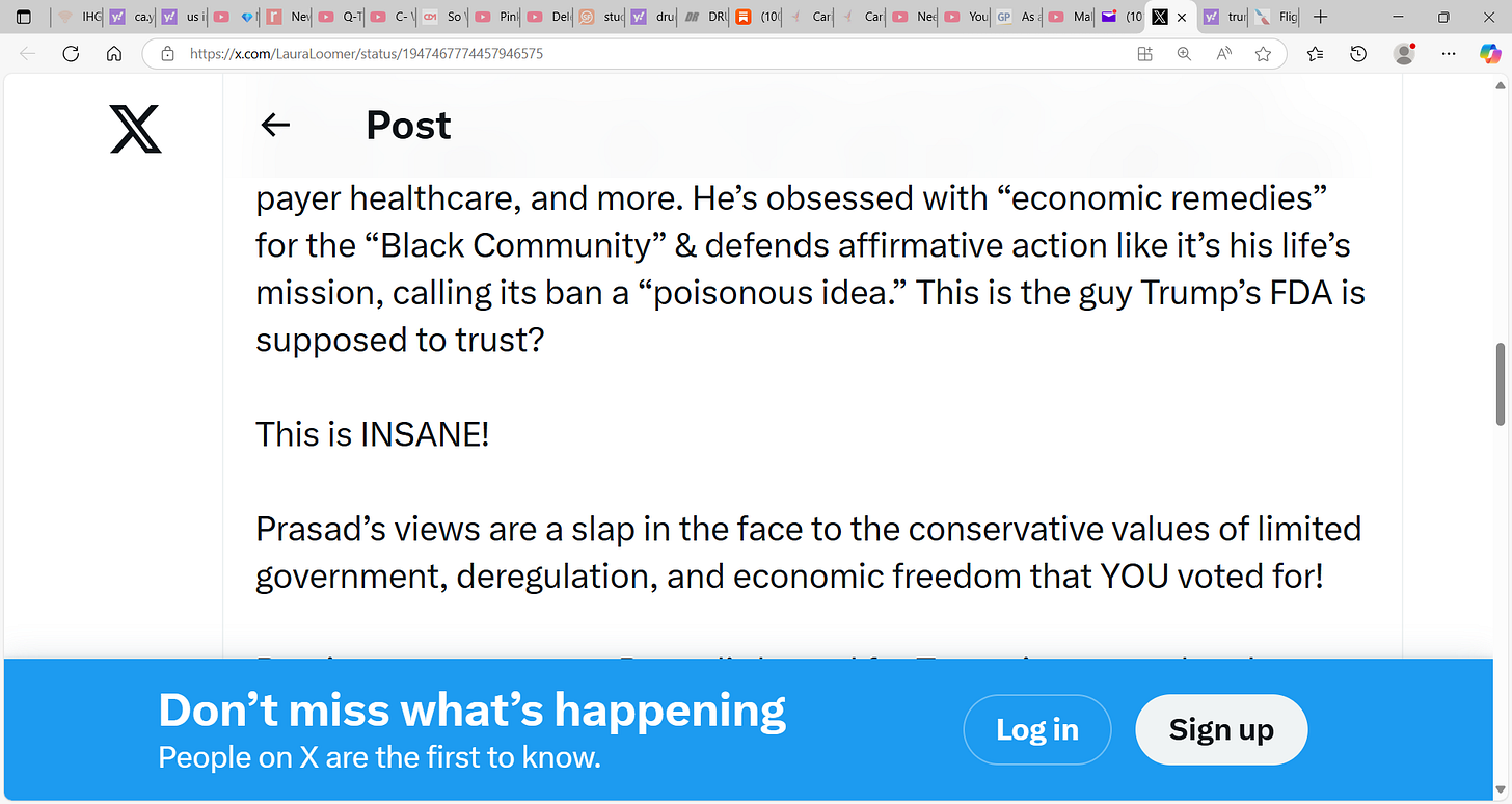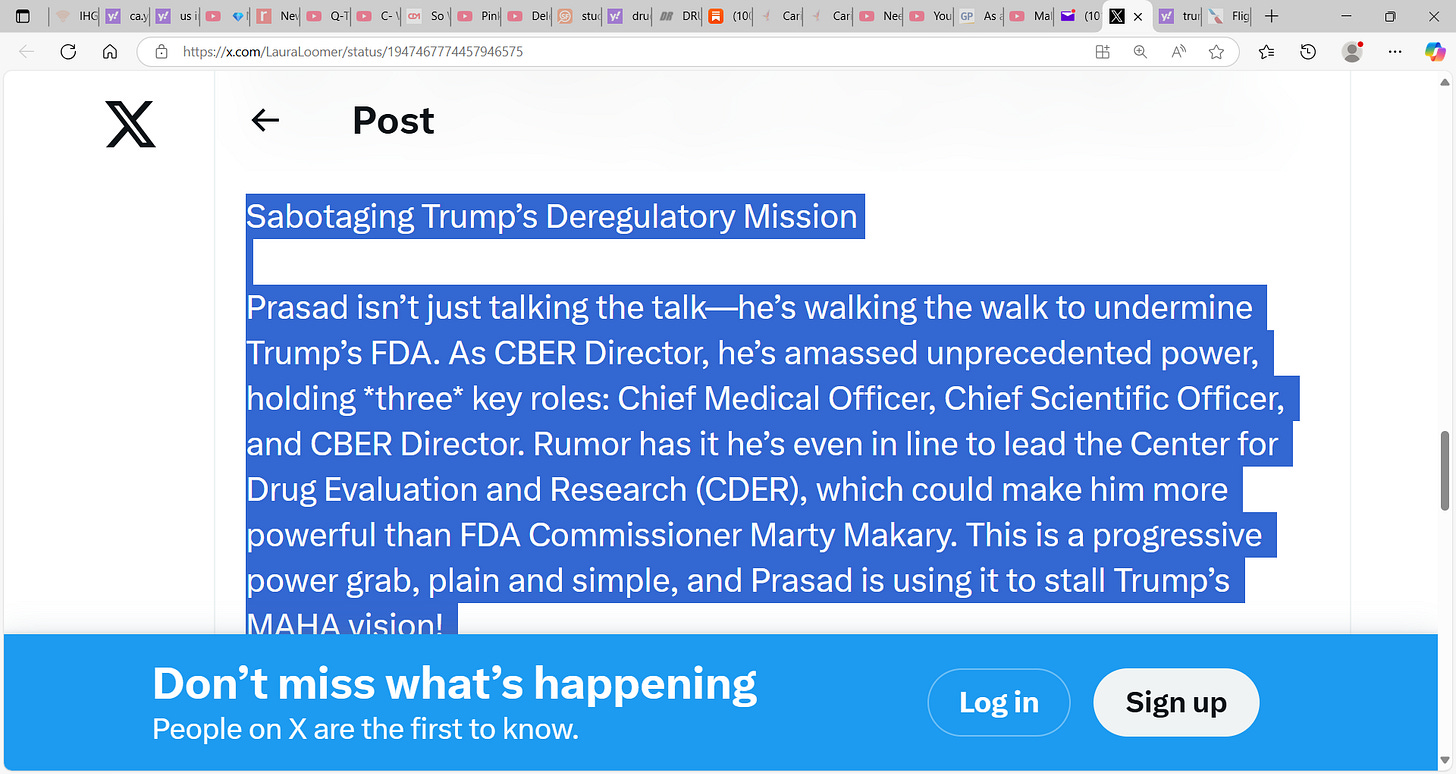 Prasad’s policy positions read like a socialist manifesto: universal basic income, student loan forgiveness, open borders, Roe v. Wade abortion standards, a 50% tax rate on high earners, a wealth tax, single-payer healthcare, and more. He’s obsessed with “economic remedies” for the “Black Community” & defends affirmative action like it’s his life’s mission, calling its ban a “poisonous idea.” This is the guy Trump’s FDA is supposed to trust? This is INSANE! Prasad’s views are a slap in the face to the conservative values of limited government, deregulation, and economic freedom that YOU voted for! But, it gets even worse. Prasad’s hatred for Trump is personal and vicious. He’s called our President “perhaps the worst in the history of the Republic” and mocked him as “orange man”, a disgusting jab straight out of the radical Left’s playbook. He’s smeared Trump’s family separation policy as a “human rights violation,” laughed off election fraud concerns as “pathetic,” and called January 6 “a terrible day.” He even worships Dr. Anthony Fauci, gushing over “St. Anthony” as he calls him, and says he views Fauci with “profound reverence. This is not a man who can be trusted to carry out Trump’s agenda as Prasad is a traitor to the cause! Sabotaging Trump’s Deregulatory Mission Prasad isn’t just talking the talk—he’s walking the walk to undermine Trump’s FDA. As CBER Director, he’s amassed unprecedented power, holding *three* key roles: Chief Medical Officer, Chief Scientific Officer, and CBER Director. Rumor has it he’s even in line to lead the Center for Drug Evaluation and Research (CDER), which could make him more powerful than FDA Commissioner Marty Makary.