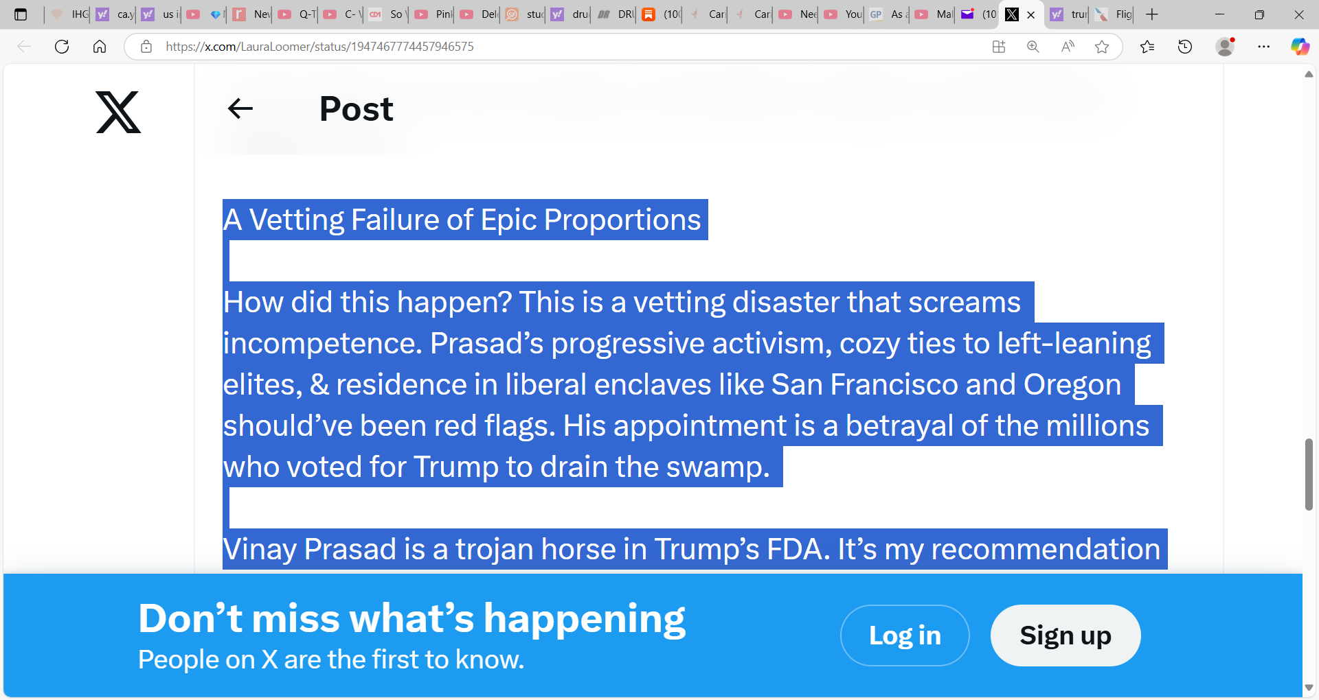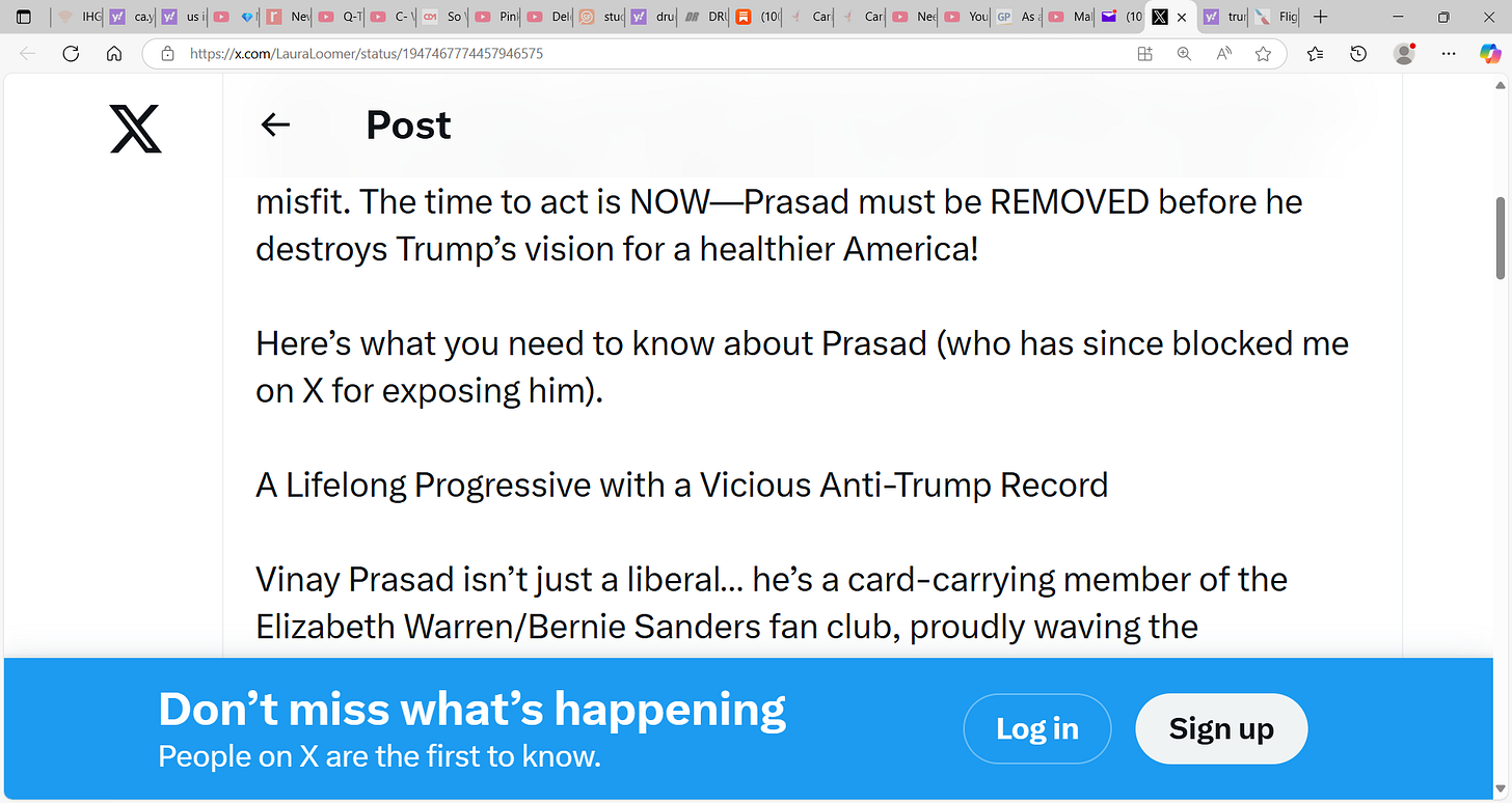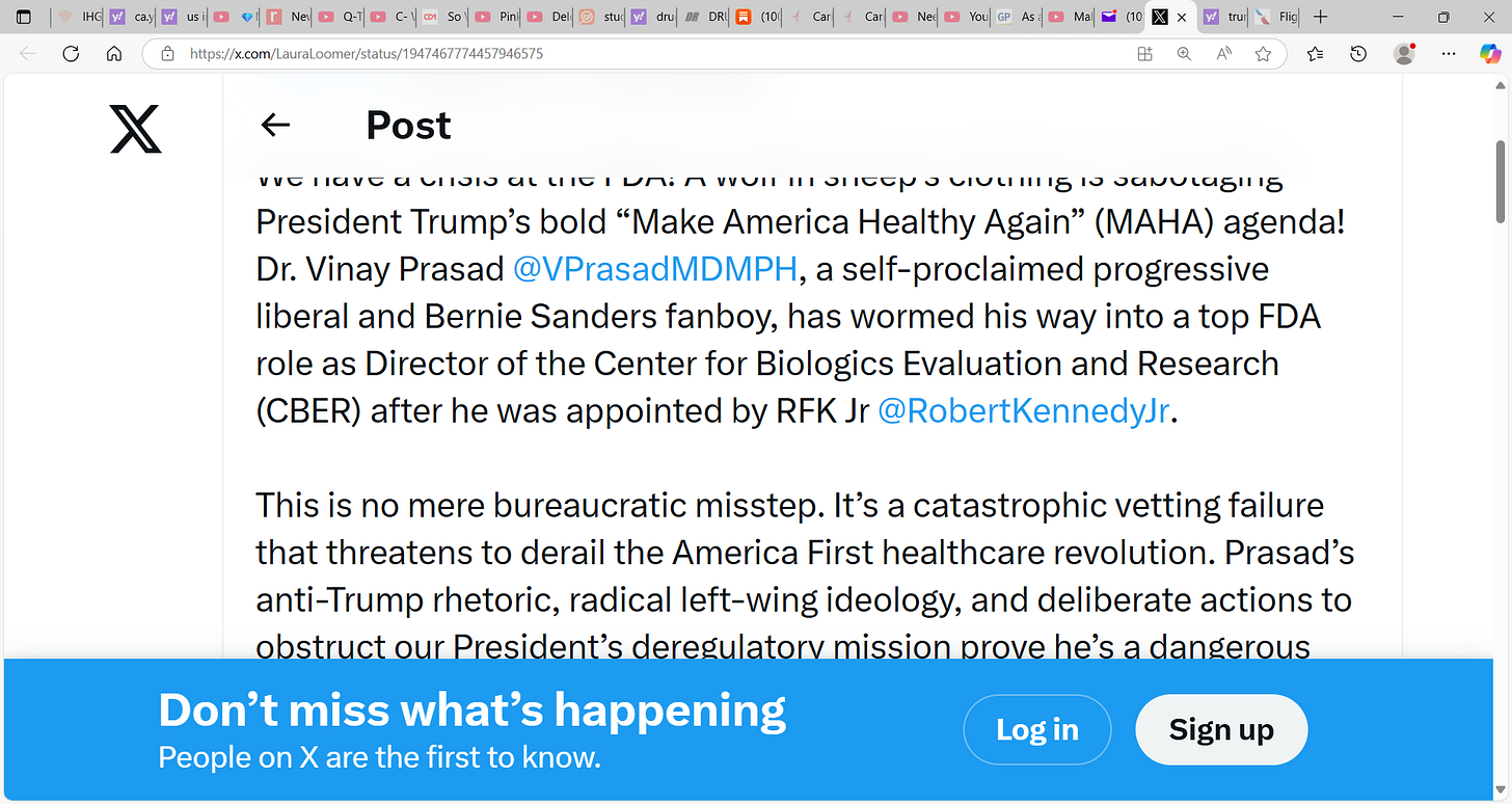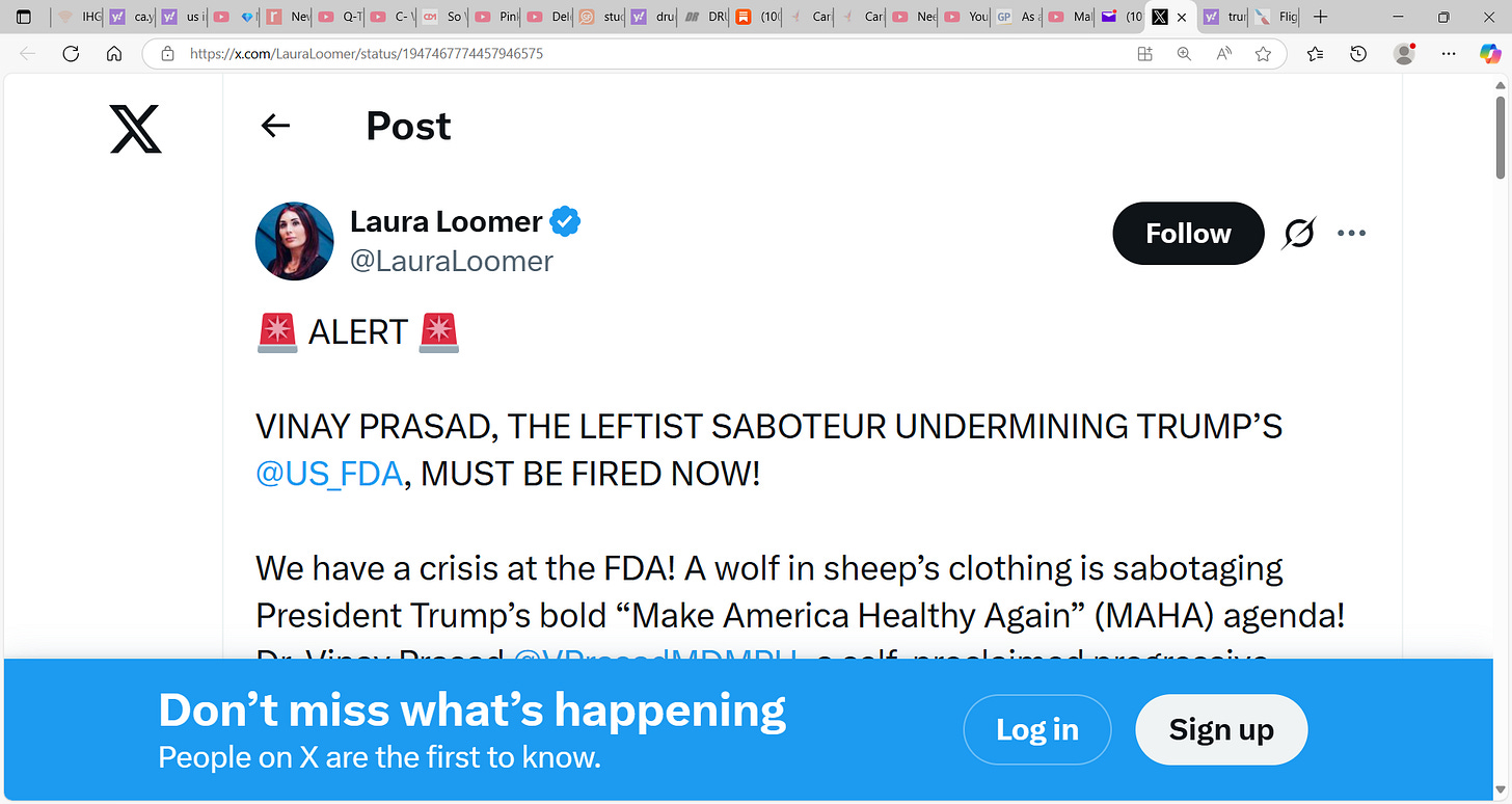 Loomer is 100% correct! Vinay Prasad, MUST be fired immediate by POTUS Trump, forget RFK Jr., he did it, so you Trump fire Prasad! I have written openly here Prasad is inept, a moron, dangerous & is