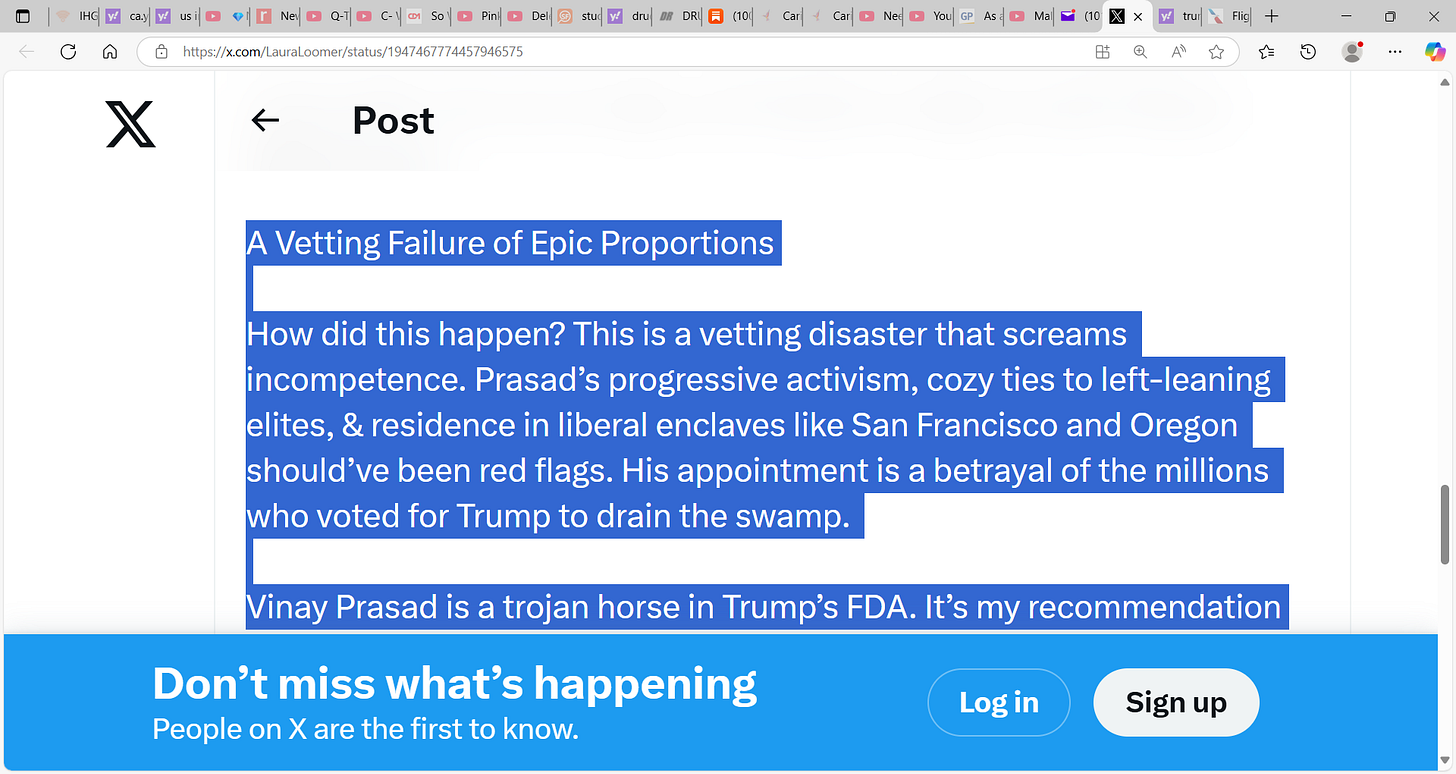 This is a progressive power grab, plain and simple, and Prasad is using it to stall Trump’s MAHA vision! A Vetting Failure of Epic Proportions How did this happen? This is a vetting disaster that screams incompetence. Prasad’s progressive activism, cozy ties to left-leaning elites, & residence in liberal enclaves like San Francisco and Oregon should’ve been red flags. His appointment is a betrayal of the millions who voted for Trump to drain the swamp. Vinay Prasad is a trojan horse in Trump’s FDA. It’s my recommendation that he be FIRED from the Trump admin.’