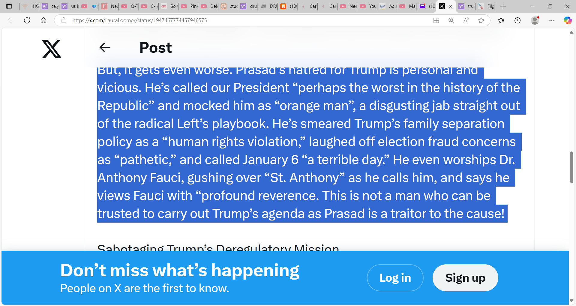 Loomer is 100% correct! This had blessings of RFK Jr. and makes you wonder and I am upset by this by RFK Jr. You must have know RFK Jr. how anti-Trump and idiotic and pure clueless this dolt Prasad is…oh so you thought a few You Tubes made him smart? This moron supports mRNA vaccine full…hates Trump, declared it openly….now in charge of vaccines? this is as bad as putting moronic Garden Gnome grifter deadly mRNA Malone on ACIP…this guy openly hated Trump and he can think he cleaned up the net but we have all his anti-Trump views….RFK Jr., you failed here I have to say so now Trump must clean up the mess on isle 7…