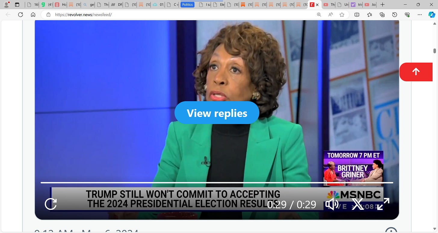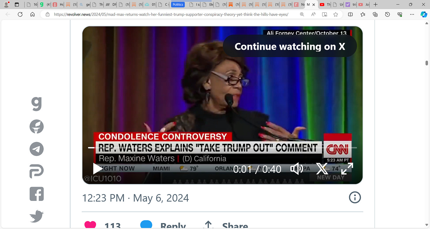 MAD MAX Maxine Waters, Ms. Gorilla glue dentures lady, this nutcase, can't get the dentures on straight, but once again popping off on Trump and MAGA, unhinged at her best of times, 45 living in her