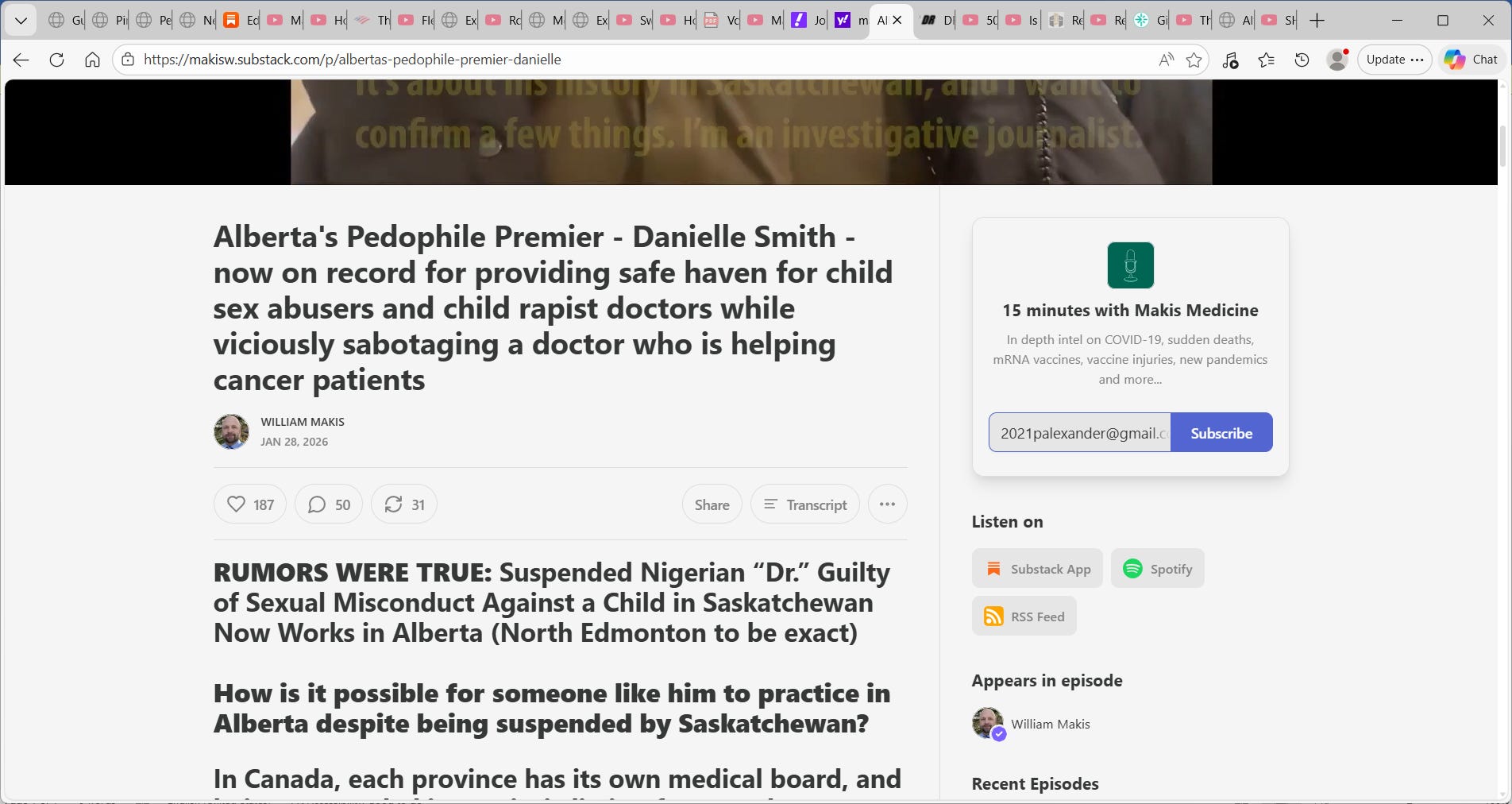 Makis: 'Alberta's Pedophile Premier - Danielle Smith - now on record for providing safe haven for child sex abusers and child rapist doctors while viciously sabotaging a doctor who is helping cancer