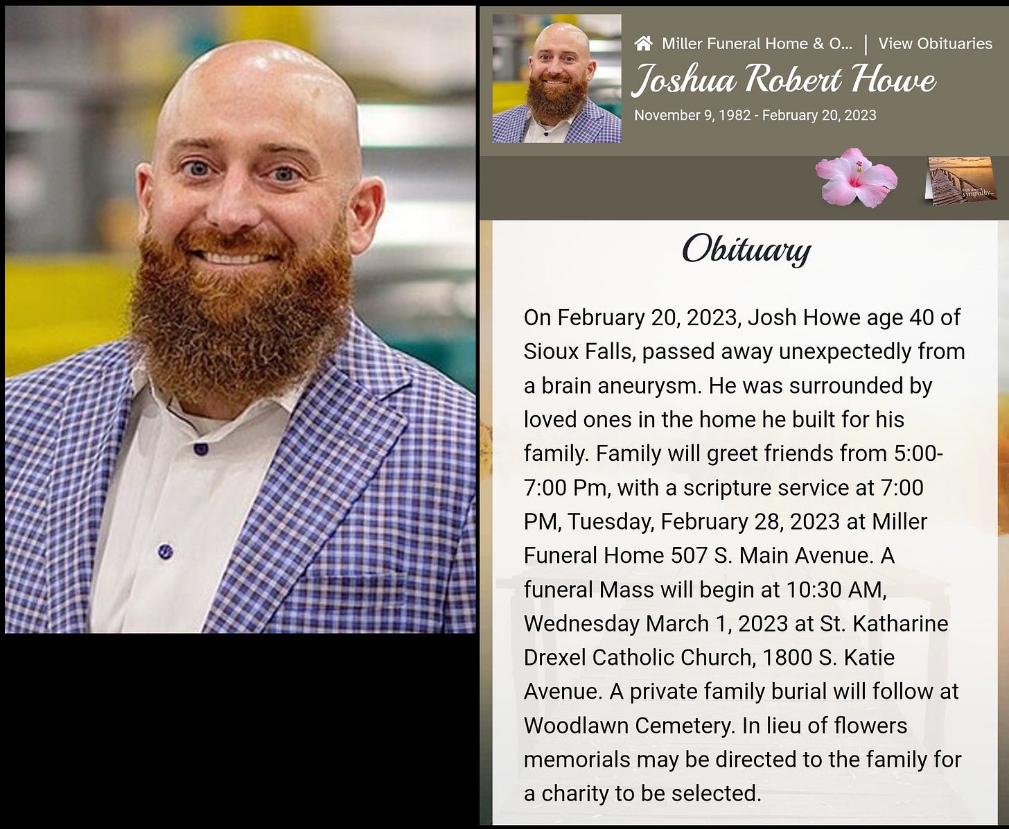 Feb.20, 2023 - Sioux Falls, SD - 40 year old Joshua Robert Howe died unexpectedly from a brain aneurysm.