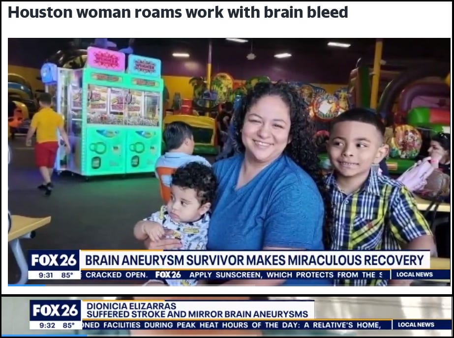 June, 2023 - Houston, TX - Dionicia Elizarras suffered a ruptured brain aneurysm at work. She stayed overnight, roaming around her workplace, not realizing what had happened to her! (click here)