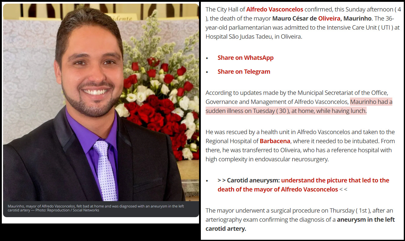 June 4, 2023 - Alfredo Vasconcelos, Brazil - 36 yo mayor Mauro Cesar de Oliveira, aka Maurinho, died suddenly at home while eating lunch. He had a ruptured carotid artery aneurysm.