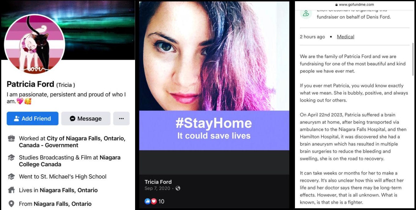 April 22, 2023 - Niagara Falls, ON - Patricia Ford, a 30 yo woman who works for the government, collapsed with a brain aneurysm. (click here)