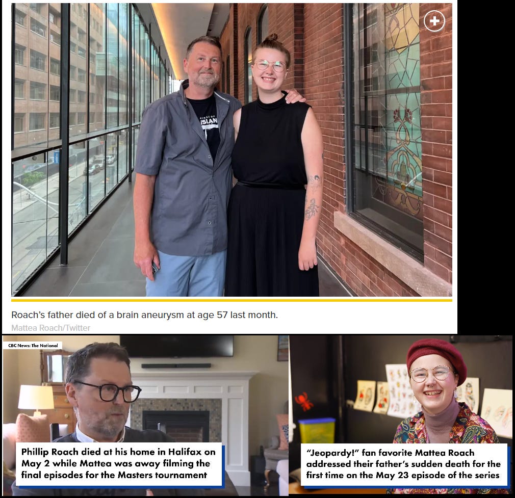 May 2, 2023 - Halifax, NS - 57 year old Phillip Roach, father of a Jeopardy! TV show winner Mattea Roach, died suddenly from brain aneurysm. (click here)