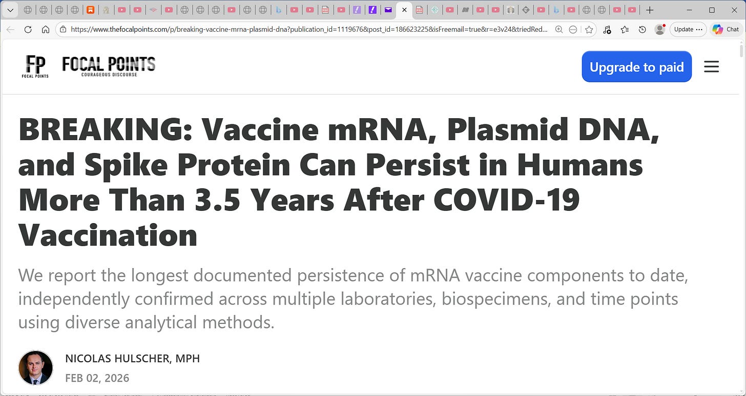 The resulting paper, titled “Unprecedented Persistence of Vaccine mRNA, Plasmid DNA, Spike Protein, and Genomic Dysregulation Over 3.5 Years Post–COVID-19 mRNA Vaccination,” presents what is, to our knowledge, the most comprehensive COVID-19 vaccine injury case report to date — involving >40 emergency department visits, >200 specialist encounters across 18 medical disciplines, >100 laboratory investigations, >100 imaging studies, and serial blood and tissue sampling performed at multiple timepoints over more than 3.5 years.