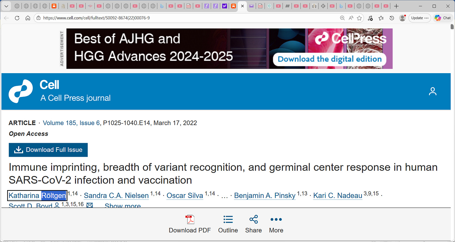 Key study in CELL and helped verify aspects of this COVID virus in terms of immunological response post vaccine; showed us the immunological fixation, or imprinting, or prejudice to the initial exposure e.g. if initial exposure is to legacy Wuhan strain, the antibody response will principally be to the legacy strain; and that the content of the vaccine e.g. LNP and mRNA persists prolonged in the body and we can infer spike is also manufactured cellularly (translated) long-term, no ‘off’ switch. There was prolonged detection of vaccine mRNA in LN germinal cells and spike antigen in LN germinal cells and blood following SARS-CoV-2 mRNA vaccination. As much as 60 days post mRNA vaccine. The issue is even with McCullough, finding vaccine and content 3.5 years post shot means that this is the point of assessment in the study. I argue this can be detected life-long and thus deleterious effects can be had life-long. Had they studied it for 10 years post shot, they will find mRNA etc. Life-long. Malone et al. knew this. Did not care. Stayed silent.