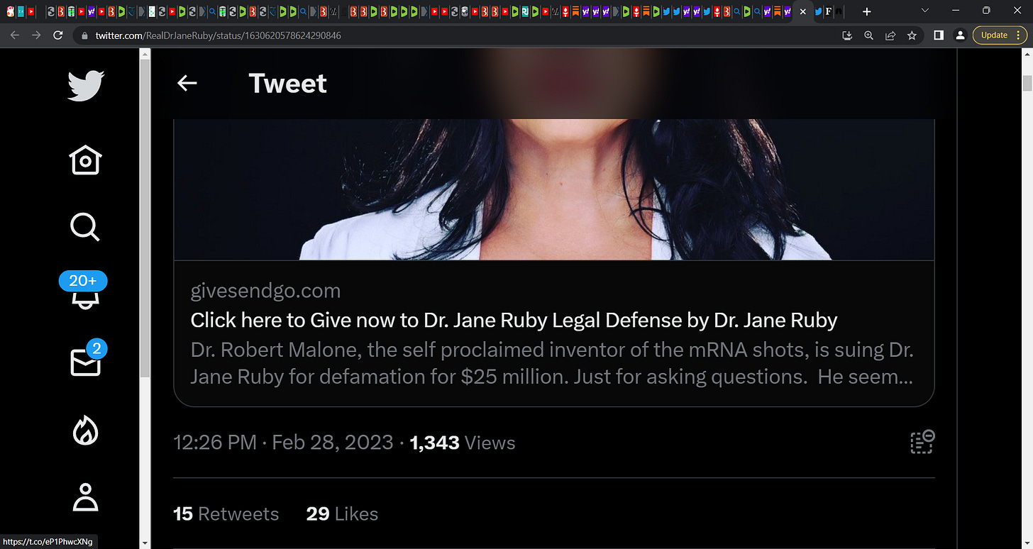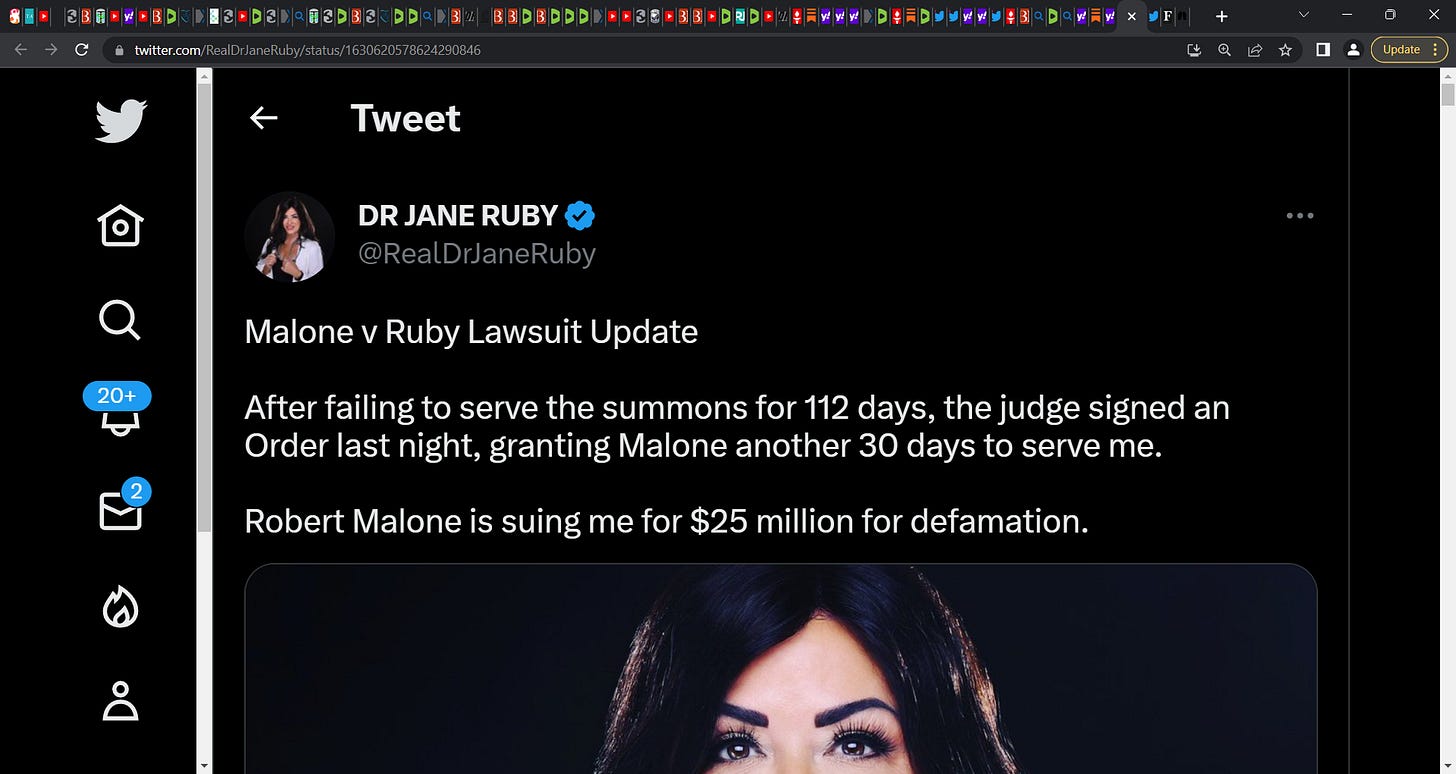 Malone sues Dr. Jane Ruby for 25 million $, alike the Breggins; why? All I could ask is, why? Just thought you should know. All these people suing, what is wrong with them? This is censoring, chilling