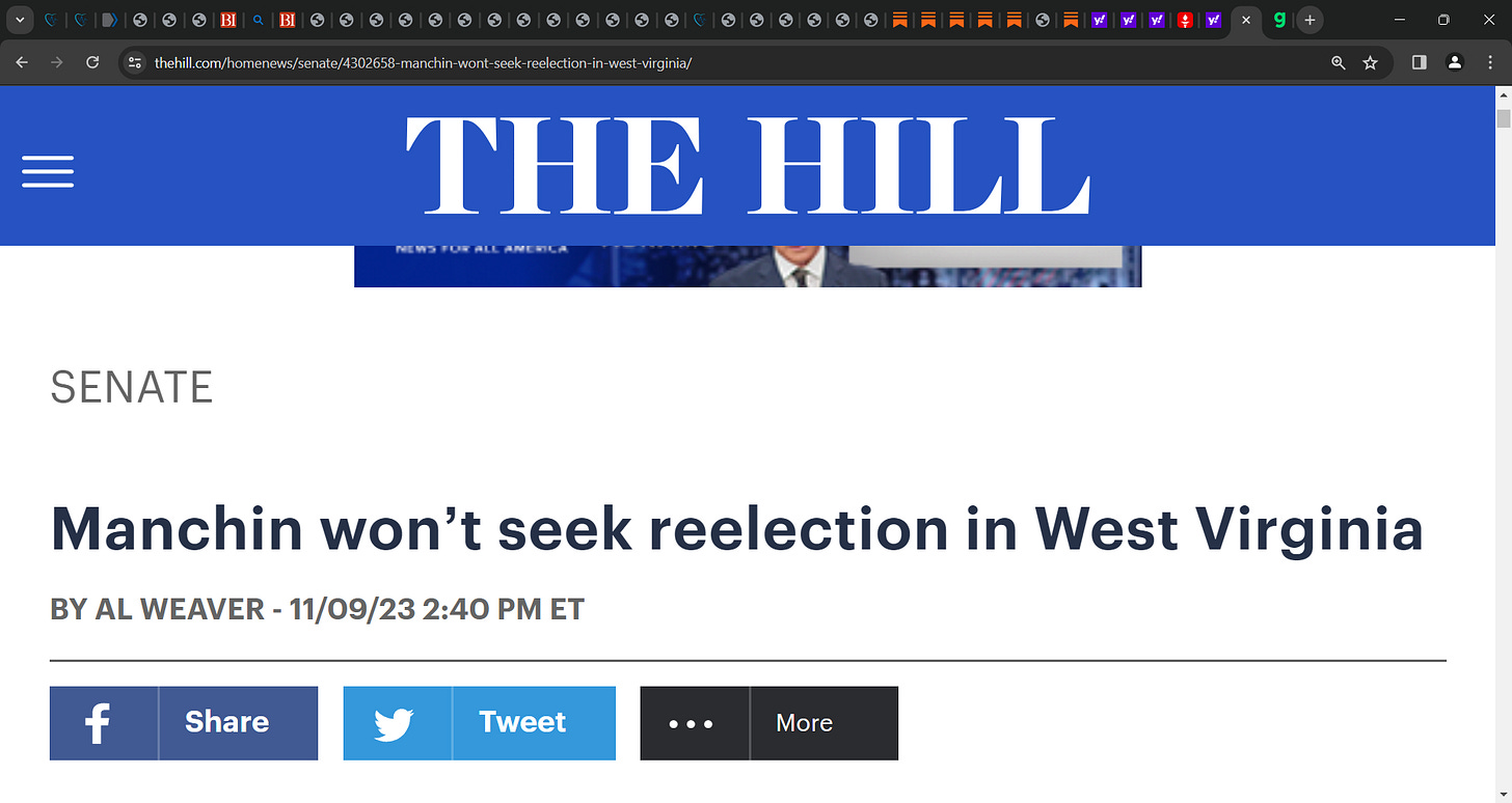 'Manchin won’t seek reelection in West Virginia...almost certainly handing Republicans a seat in next year’s elections in a deep red state.' why? because he cannot win, all the corrupted votes he cast