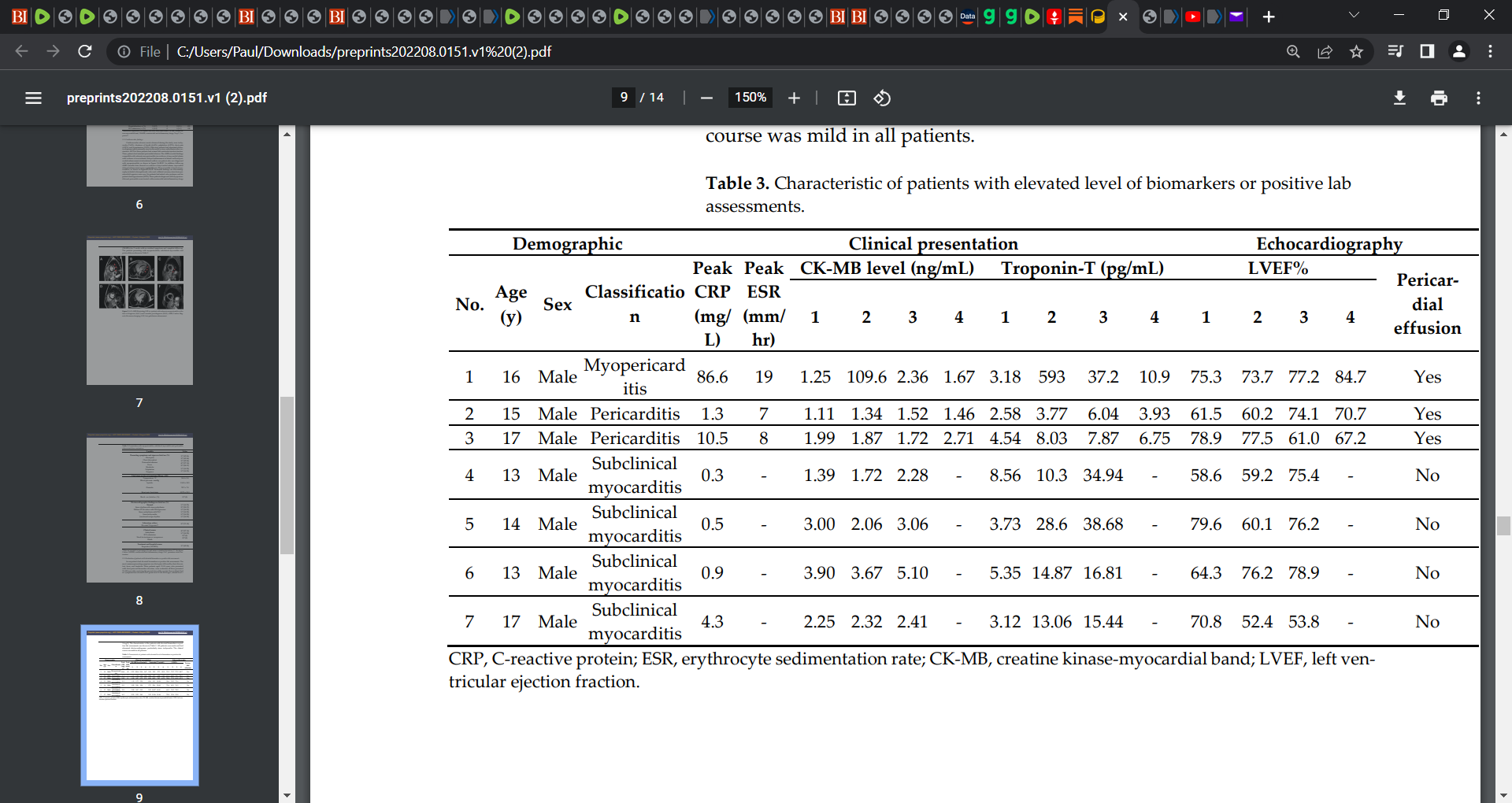 I haven’t had a chance to read the full study yet but I am wondering about the statement that all the injured fully recovered within 14 days. From my understanding you do not fully recover from myocarditis and pericarditis. I guess I need to read it in its entirety to understand that statement in the abstract.